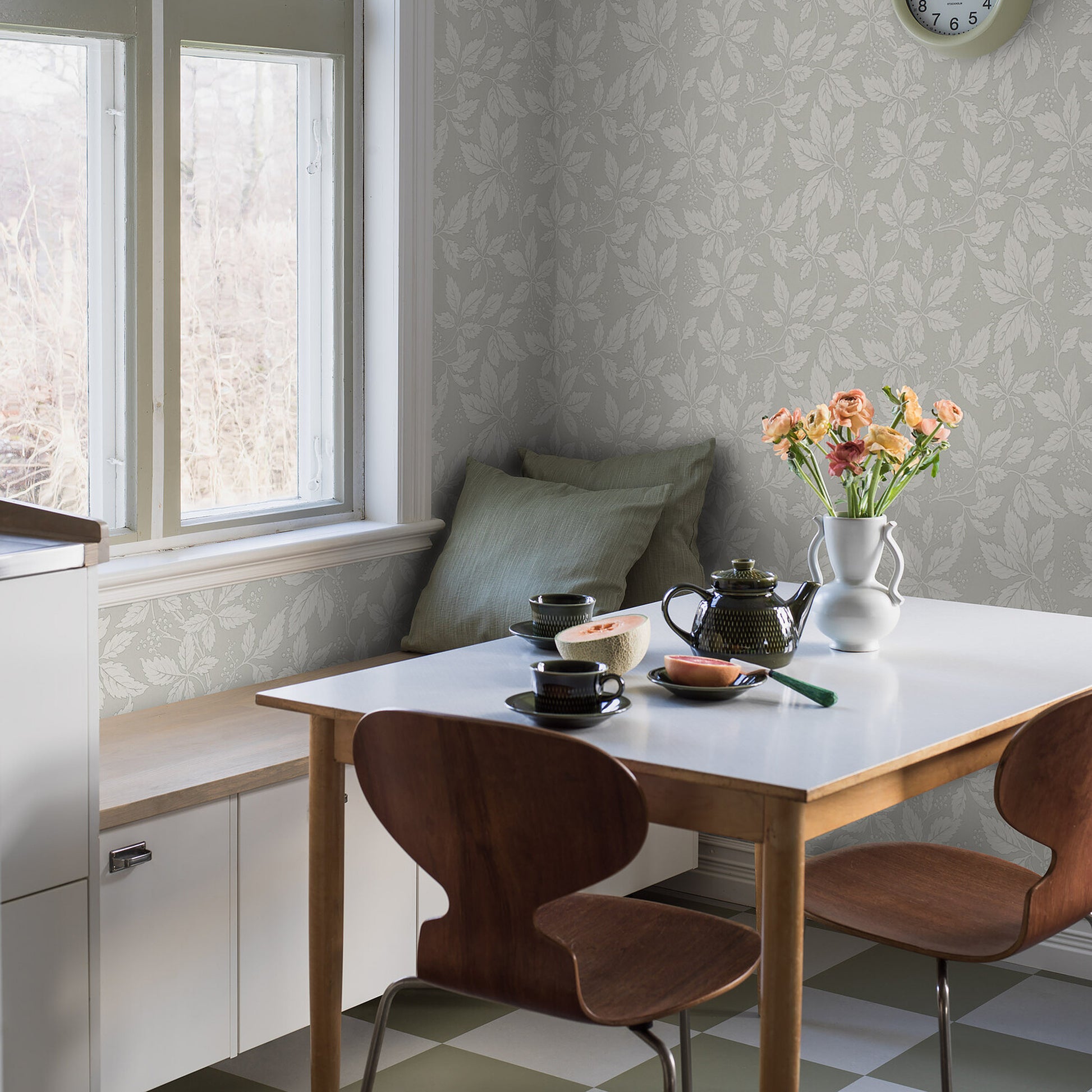 Use:Vildvin in leaf is a striking illustration of the Virginia vine, a pretty plant with five leaves and clusters of dainty berries. This enchanting botanical climbs up the wall and effortlessly uplifts the surrounding space. Bor?stapeter's versatile wallpaper works wonderfully in a wide range of rooms. This product is FSC Certified. Available in North America exclusively through Schumacher.