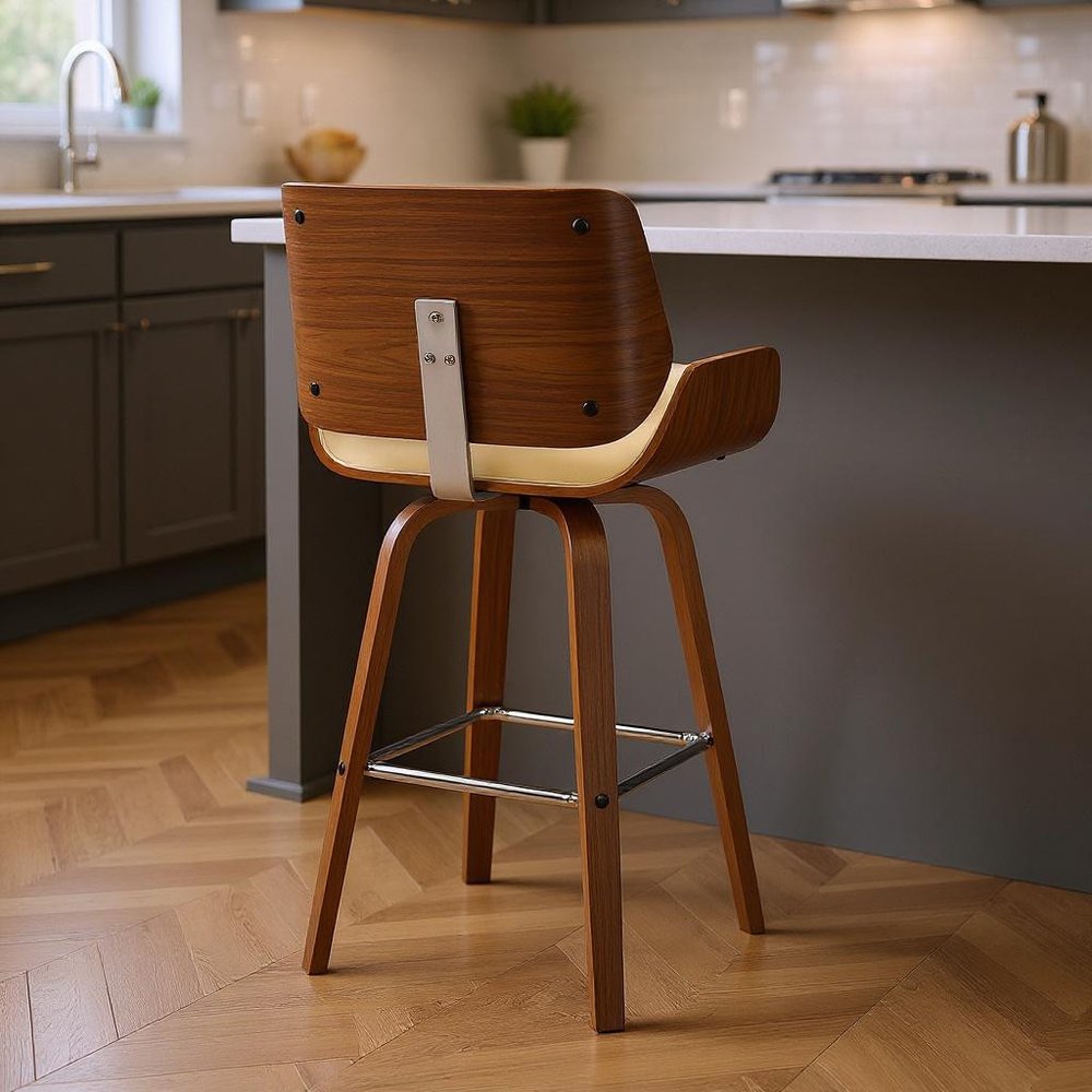 26" Cream And Brown Faux Leather And Solid Wood Swivel Counter Height Bar Chair
