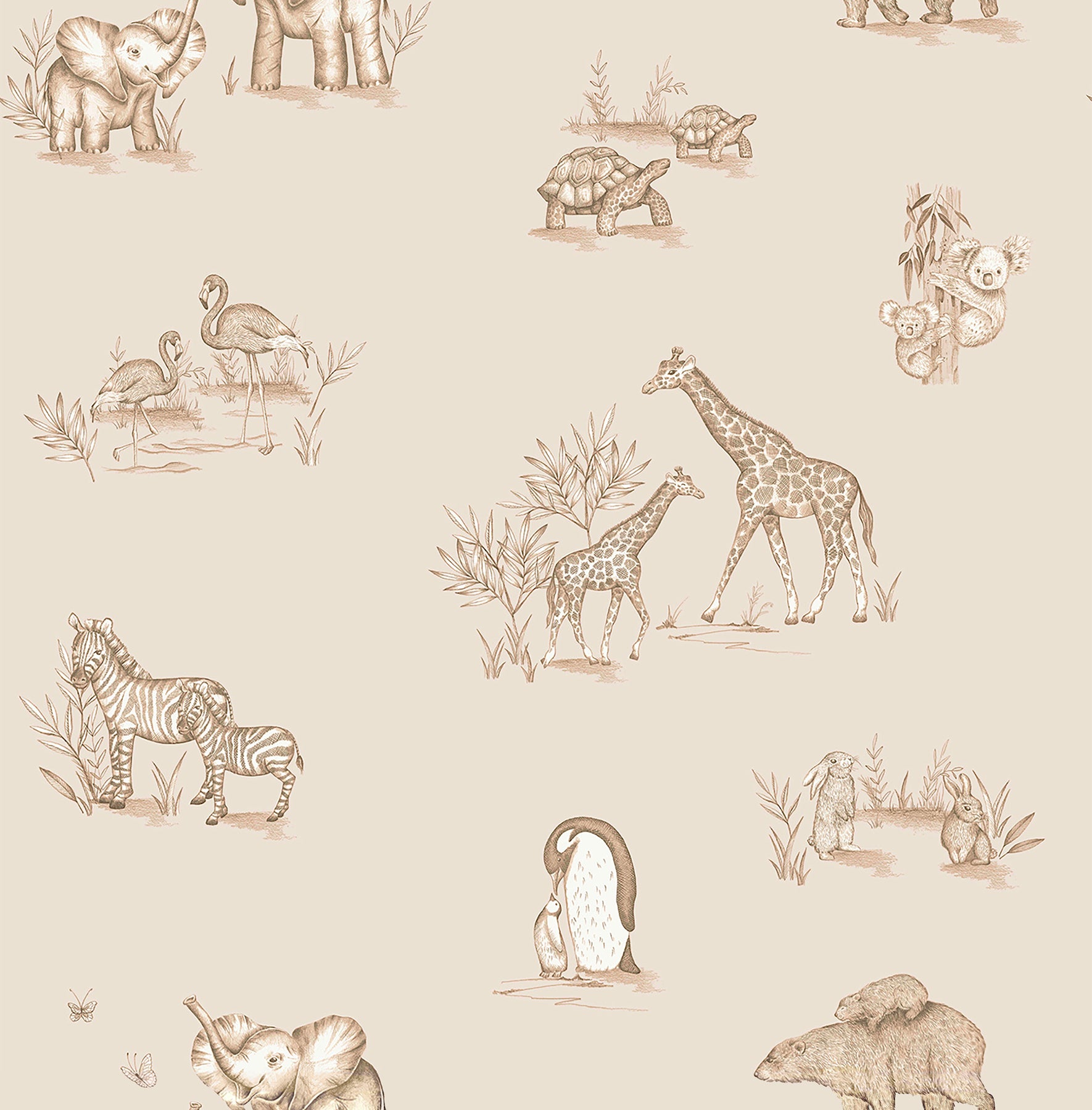 Use:Safari Babies features some of your favorite savannah animals paired up with a doting parent! Seen here illustrated in taupe, charcoal, and white against beige. Safari Babies is an unpasted, non woven wallpaper measuring 20.5 inches wide by 33 feet long, covering approximately 56.4 square feet per roll. Unpasted non woven material; 20.9-in repeat, straight match; Washable and strippable; 20.5-in by 33-ft long roll; Covers about 56.4 square feet;
