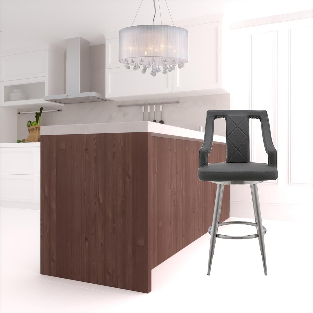 29" Gray And Silver Faux Leather And Iron Swivel Bar Height Bar Chair
