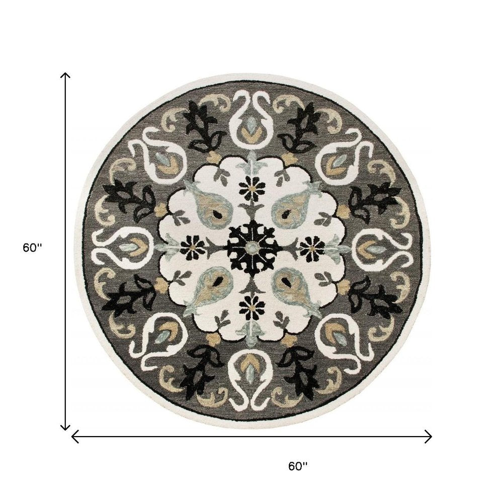 5' Gray Round Wool Hand Hooked Handmade Area Rug