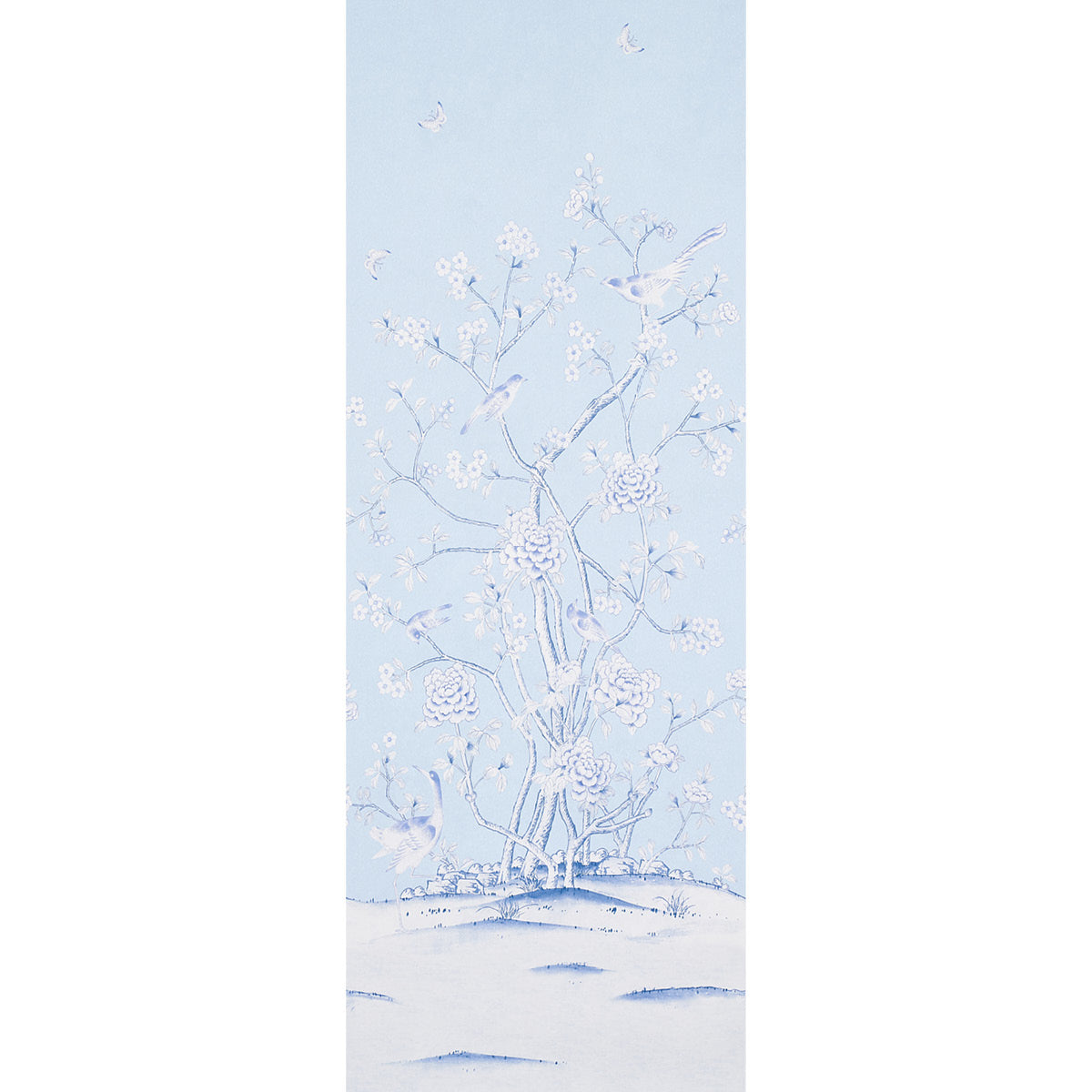 Use:Inspired by an antique Chinese silk panel, this Mary McDonald design in sky features exotic birds and cherry blossoms on panels of wallpaper with a 12-foot repeat.