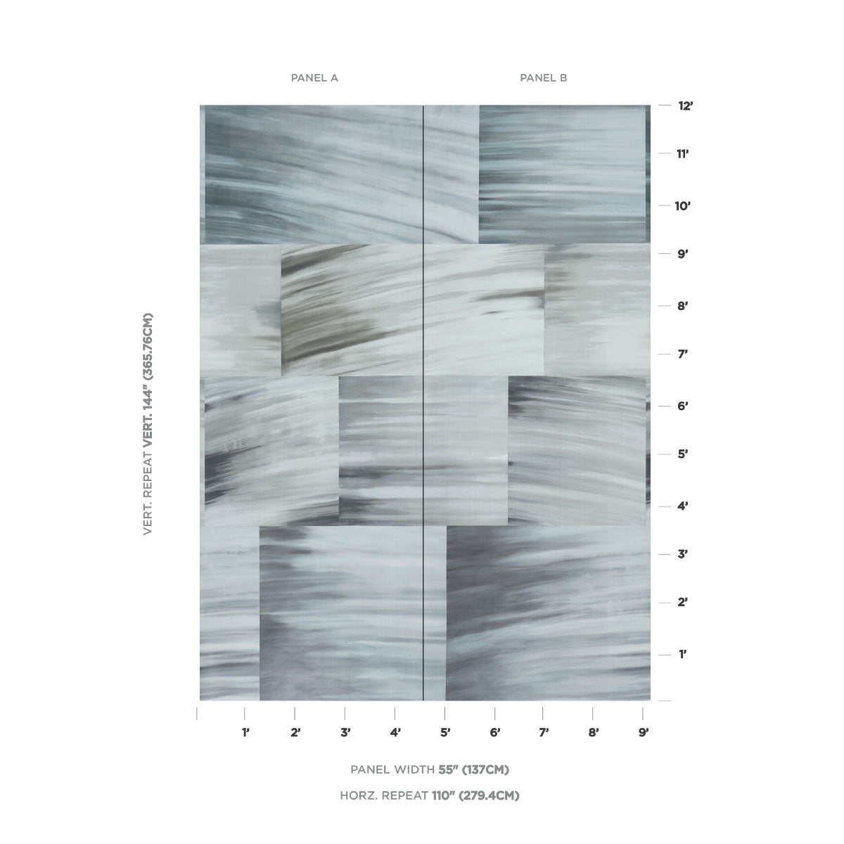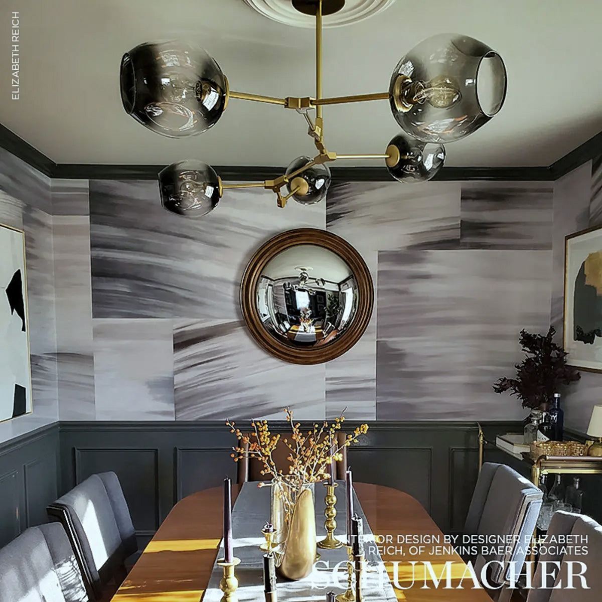 Use:A stunningly dramatic design comprised of two twelve-foot panels, hand-painted and then printed to full scale. The subtle tone on tone colorations, inspired by the natural striations in horn, make this striking wallpaper a showstopper.