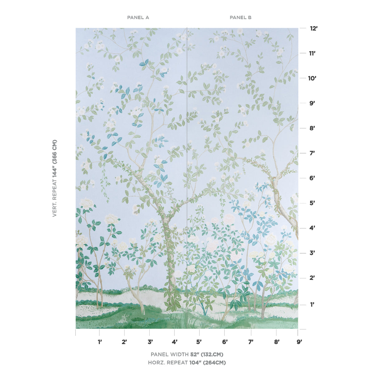 Use:English garden meets Chinoiserie in this stunning blue design. Originally drawn to scale on French canvas, this vast floral pattern is comprised of two 12' panels.