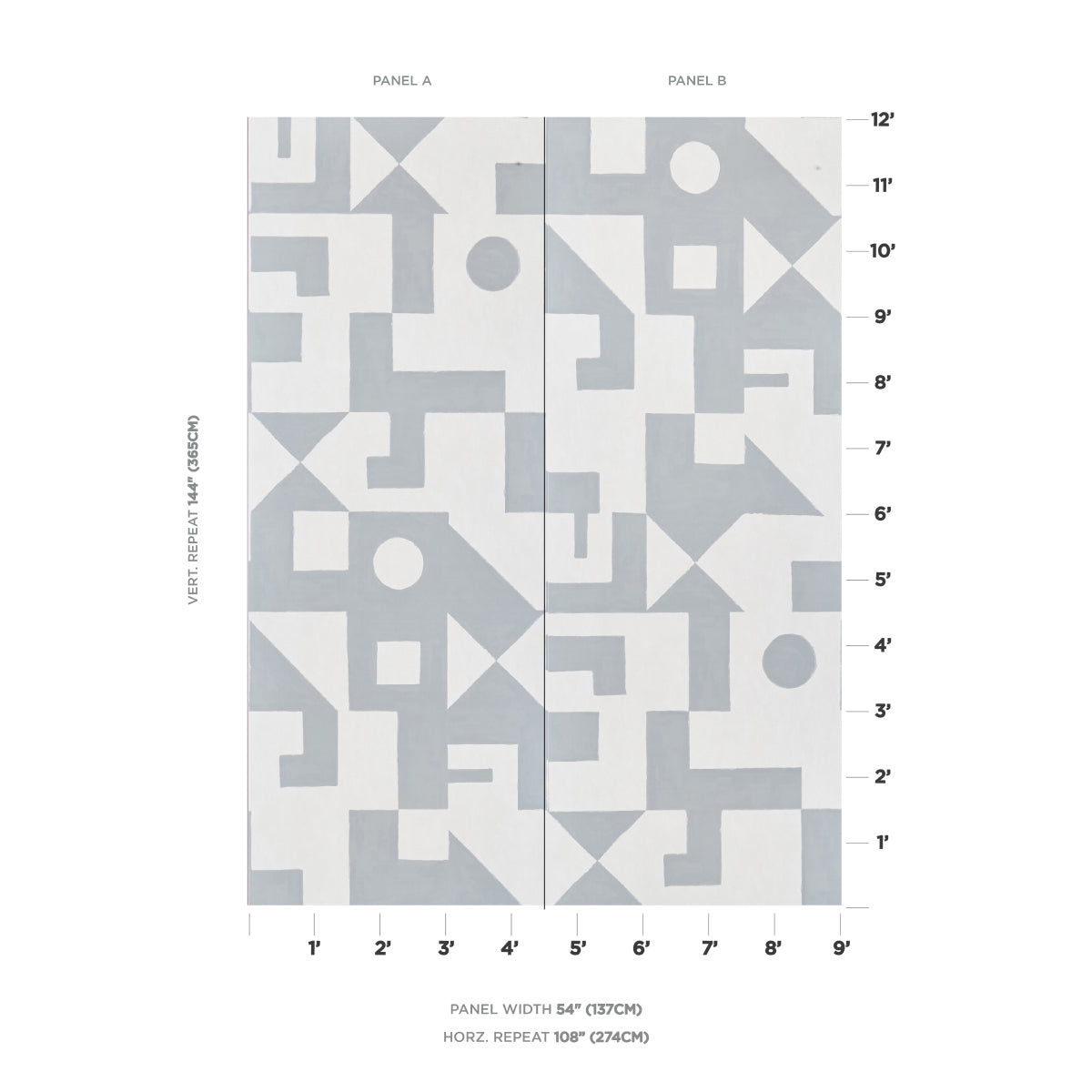Use:A stylish study of geometric shapes, this graphic pattern by Porter Teleo has a two-panel repeat. It's a striking, mural-like design that's ideal for large expanses. Also a fabric.
