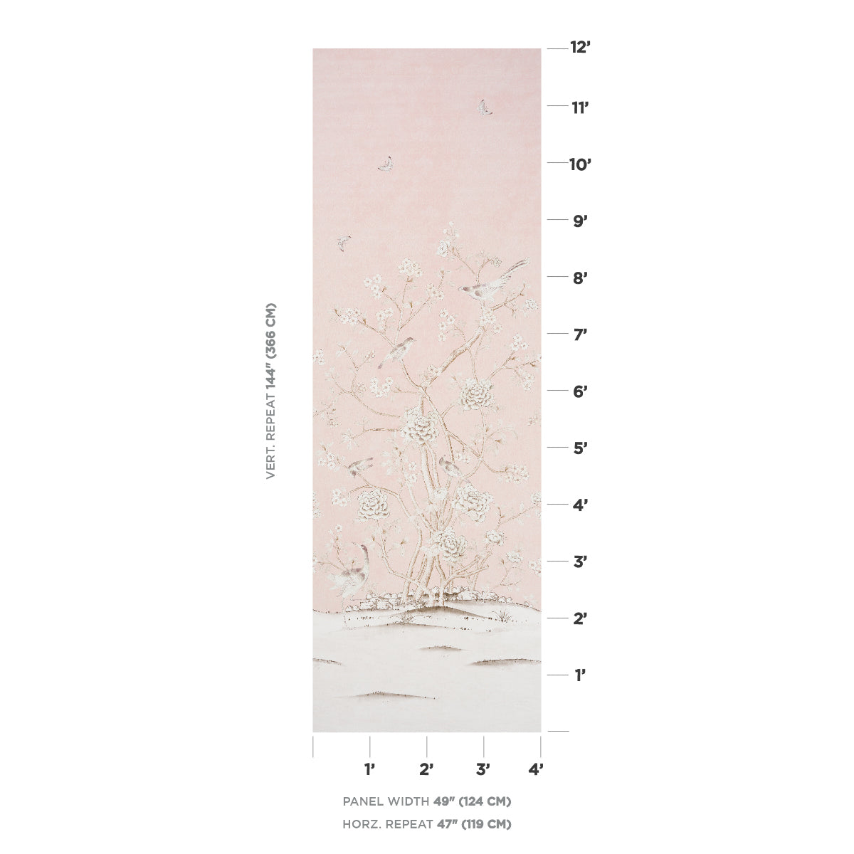 Use:Inspired by an antique Chinese silk panel, this blush-colored Mary McDonald design features exotic birds and cherry blossoms on a stippled texture background. Available in panels of wallpaper with a 12-foot repeat.