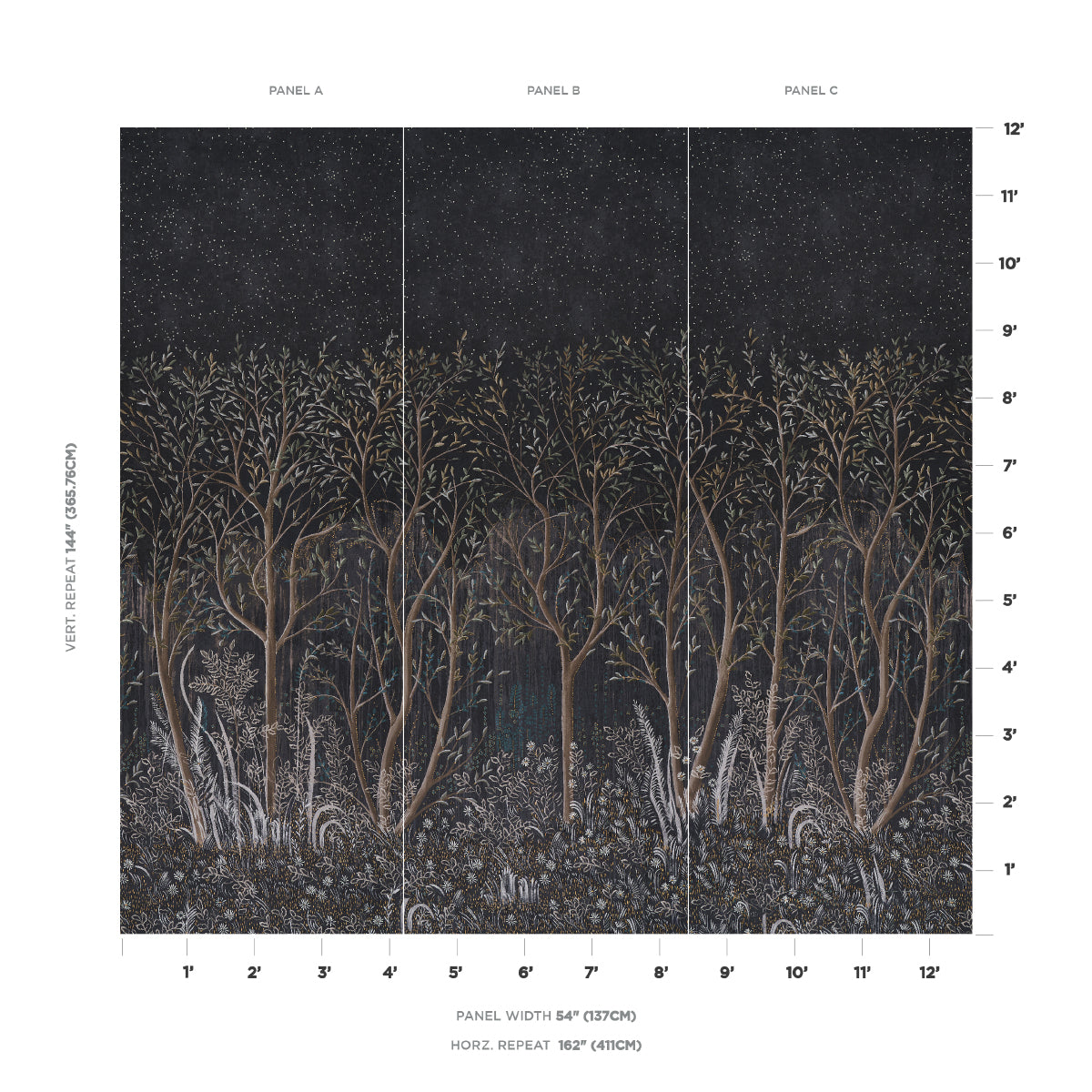 Use:IN ARTIST COLETTE COSENTINO'S FANTASTICAL DREAMSCAPE OF A FOREST, MULTI-LAYERED APPLICATIONS OF ACRYLIC PAINTS ACCUMULATE INTO A DARK, ALMOST FOREBODING MOODINESS. A DIGITAL RENDERING IN THREE NON-REPEATING PANELS RECREATES THE TEXTURAL IMPASTO AND SPONTANEOUS DRIPS.