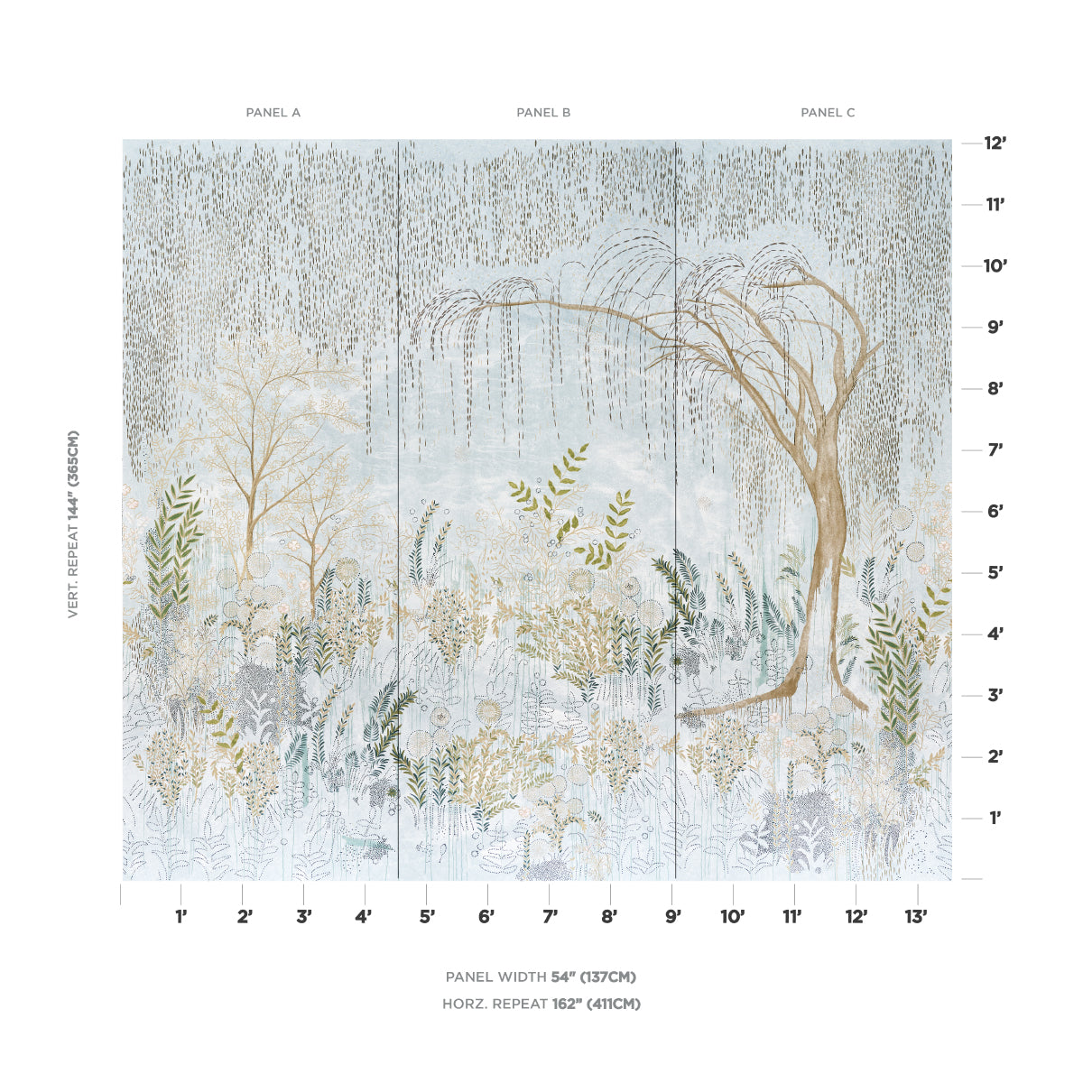 Use:Digitally printing California-based muralist Colette Cosentino's gauzy weeping willow painting on a pearlized ground imparts a subtle shimmer to the subdued haziness of the landscape. Available in three non-repeating panels.