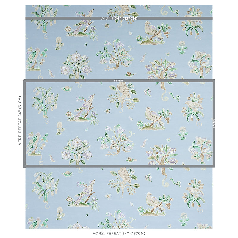 Use:You can't help but be charmed by sky-colored Magical Menagerie, a painterly study of flora and fauna that was based on an early 2th-century document in our archives. Part of the Flight of Fancy collection, it's an infinitely enchanting wallpaper design that gives any room instant and delightful character. Also available as a fabric. This pattern is exclusively available on fschumacher.com.