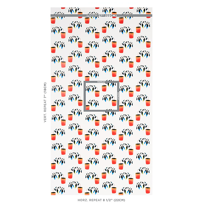 Use:With its playful arrangement of quirky, angular potted plants, Liz Nielsen's spectrum-multicolored Reaching Out is a stylized, small-scale wallpaper design rooted in traditional botanical motifs. Part of the Peg Norriss Collection, it is a wonderfully creative, contemporary take on a popular and familiar form.