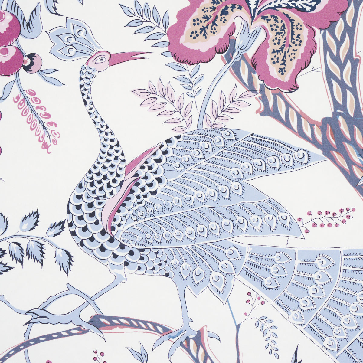 Use:Inspired by 19th-century Indian textiles, Aveline in lilac is inhabited by regal peacocks and an undulating flowering vine, both rendered with fanciful, delicate details. Also available as a fabric.