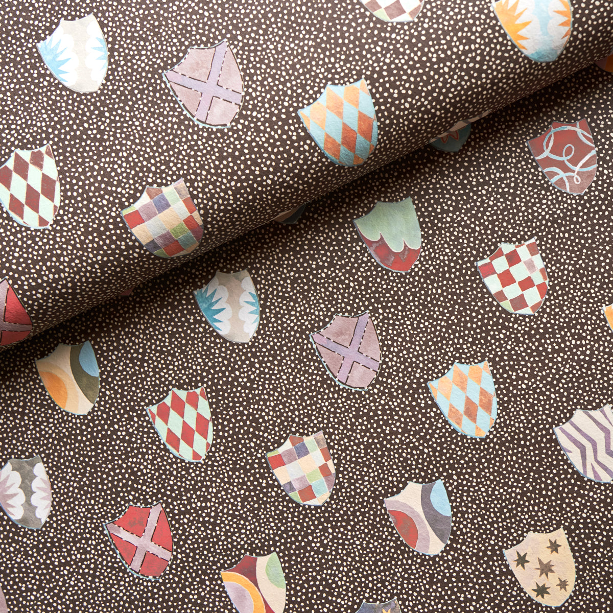 Use:A delightful mid-scale wallpaper designed by Happy Menocal, Heraldic in brown breathes new life and levity into an ancient aristocratic motif. Colorful shields featuring whimsical patterns are rendered with a painterly hand against a mottled background. Also available as a fabric.