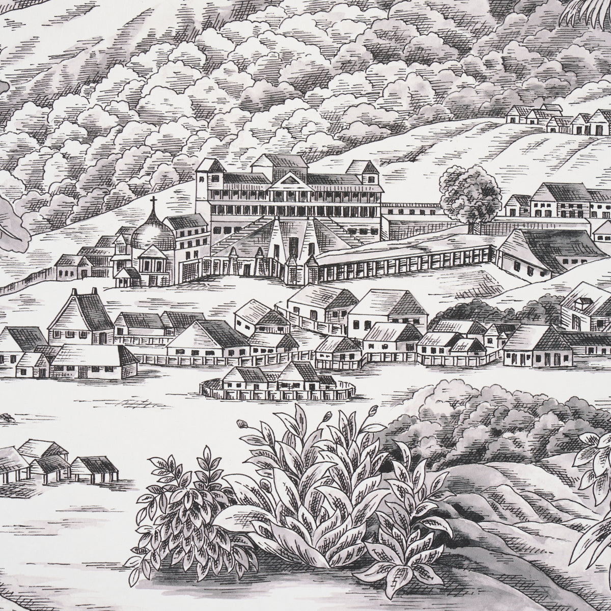 Use:Created in collaboration with Haitian American fashion designer Victor Glemaud, Toussaint Toile wallpaper in black-on-ivory pays homage to the artist's Caribbean heritage. Featuring historic scenes that celebrate Haiti's liberator, Toussaint Louverture, along with the country's native flowers, foliage and landscapes, this large-scale pattern is an inventive and illuminating take on traditional toile. Also available as a fabric.