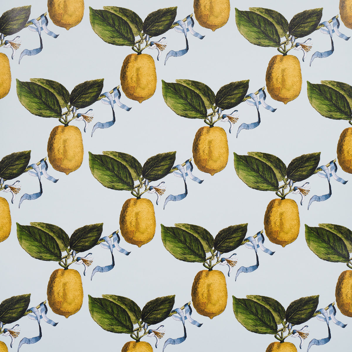 Use:Le Citron in sky is a wonderfully charming wallpaper design by Johnson Hartig of Libertine. Printed on a special coated paper with a subtle sheen, this whimsical lattice of leafy lemons has a beautiful engraved aesthetic and fluttering ribbon accents that allude to the designer's initials. This fun mid-scale pattern is also available as a fabric.