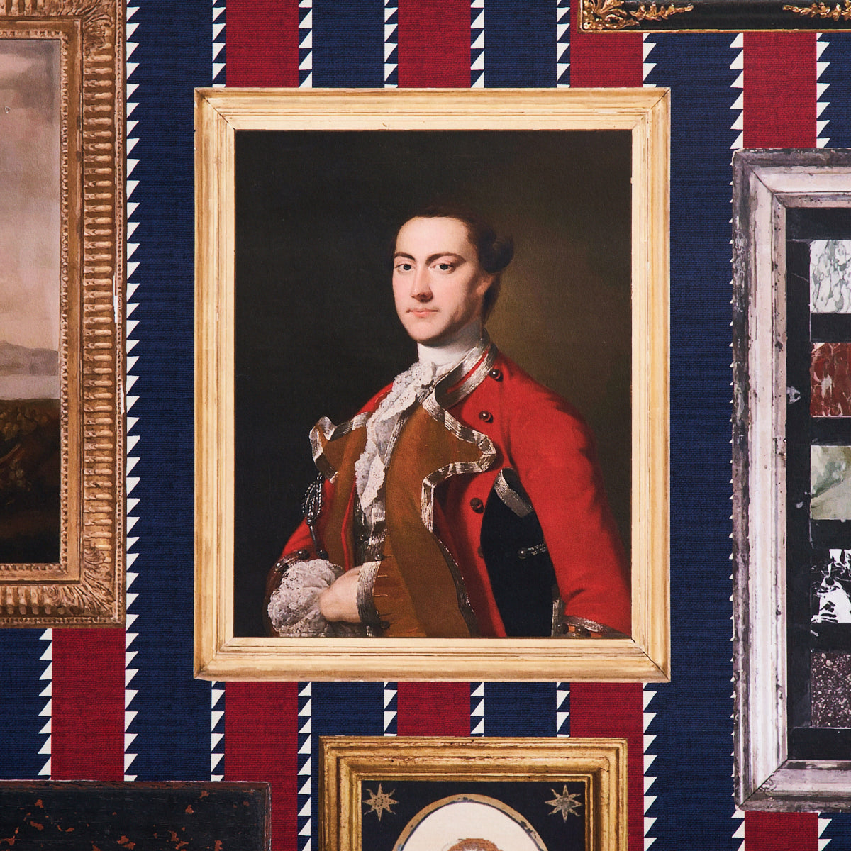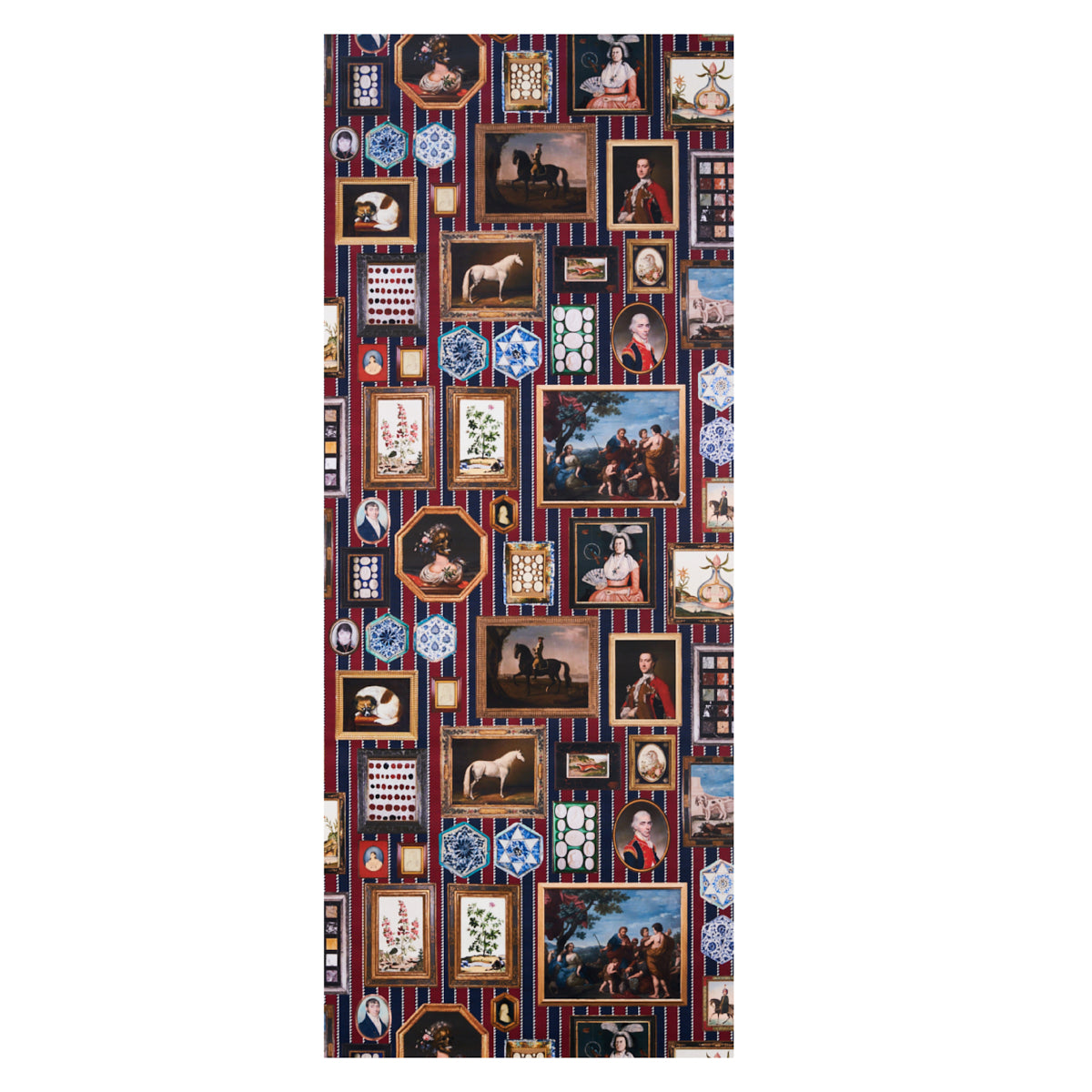 Use:Inspired by an eclectic mix of antique paintings and collectibles, Le Grand Tour in stripe is an extra-large-scale wallpaper design by Johnson Hartig of Libertine. This trompe l'oeil design is a wonderfully imaginative conversation starter, and each colorway has a completely different background. Use it along a hall or up a stairway for a charming gallery effect.????