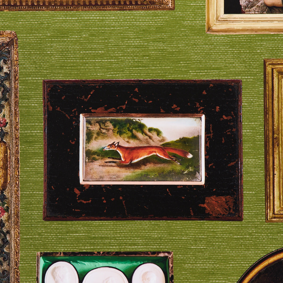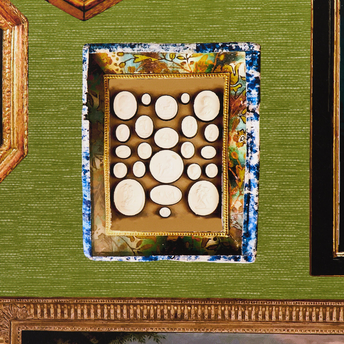 Use:Inspired by an eclectic mix of antique paintings and collectibles, Le Grand Tour in English green is an extra-large-scale wallpaper design by Johnson Hartig of Libertine. This trompe l'oeil design is a wonderfully imaginative conversation starter, and each colorway has a completely different background. Use it along a hall or up a stairway for a charming gallery effect.????