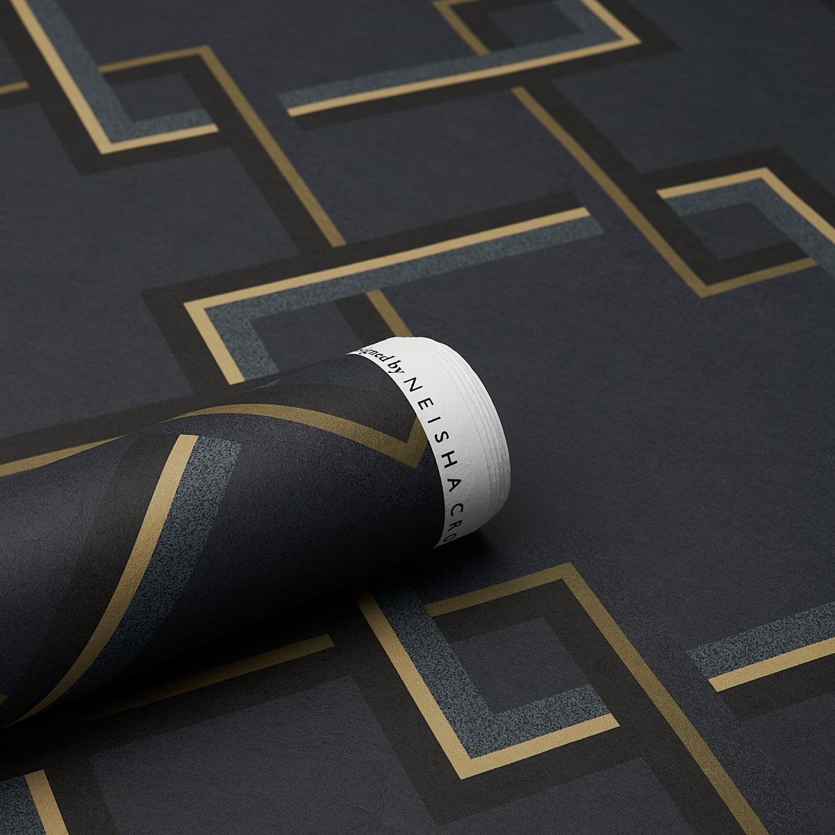 Use:Inspired by pagoda architecture, Neisha Crosland's Mah Jong in river blue is an interesting interlocking lattice pattern and an elegant take on a popular classic motif. This versatile large-scale wallpaper design, with its stylish Art Deco vibe, brings wonderful depth and sophistication to any room.