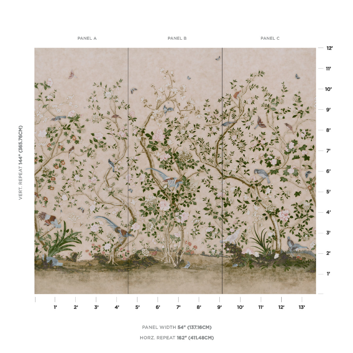 Use:Mary McDonald was inspired by an antique screen in her personal collection when she imagined this splendid three-panel wallpaper design featuring elegant birds nestled among the branches of flowering peony trees. Les Oiseaux Panel Set in parchment has a delicate hand-painted aesthetic and creates an enchanting mood in a dining room, living room or bedroom.