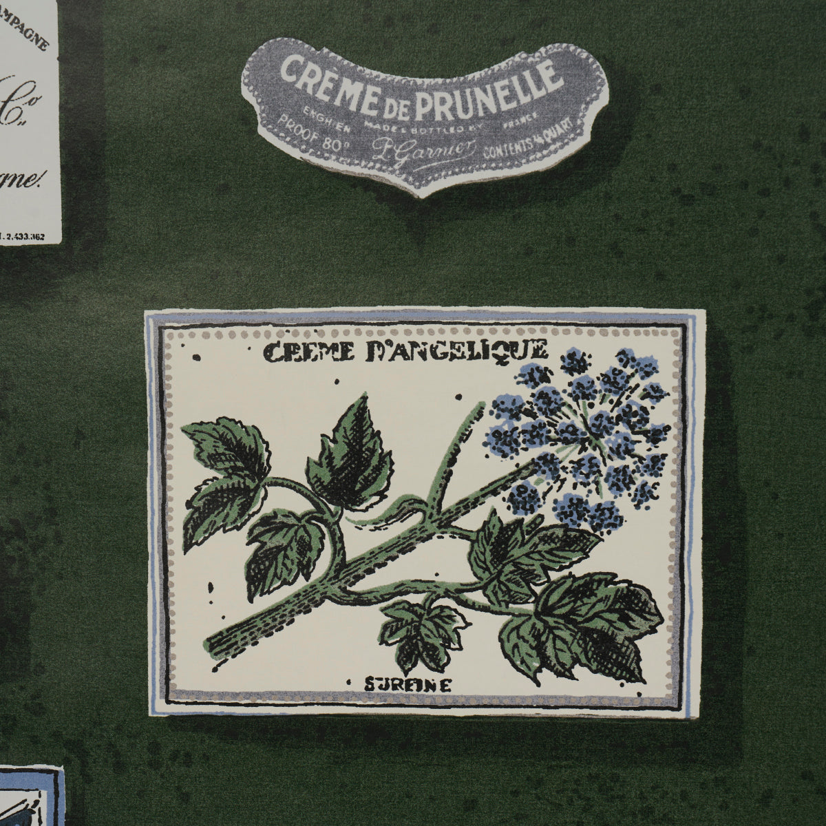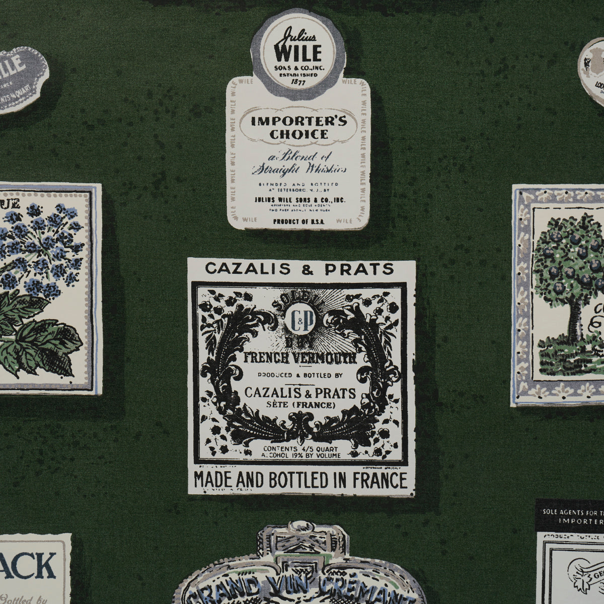 Use:A hand-printed, 1950s fabric in our archive inspired Backdrop's studio to create Salud, a fun, retro wallpaper based on liquor bottle labels. Amplifying the vintage charm and cheerful, hand-illustrated aesthetic of the original pattern, this large-scale, wide-width design gets the party started with its graphic, gallery-wall effect.