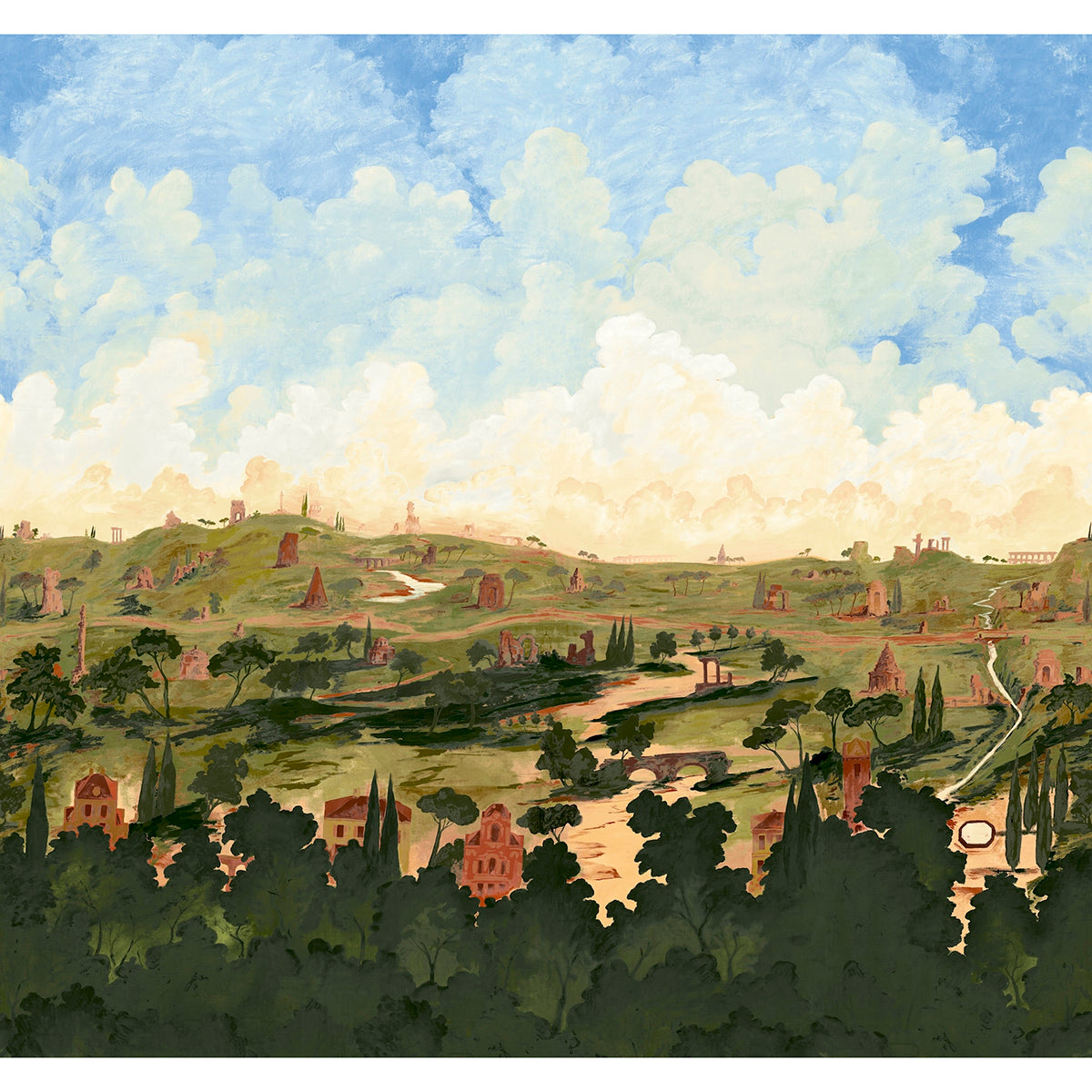 Use:BACKDROP COLLABORATED WITH ARTIST XAVIER DONNELLY TO CREATE THE APPIAN WAY PANEL SET, A SCENIC WALLPAPER DESIGN INSPIRED BY THE SOUTHERN ITALIAN COUNTRYSIDE. DEPICTING A HILLY LANDSCAPE WITH VILLAS, RUINS, RIVERS, ROADS, AND A BILLOWING CLOUDY SKY, THIS EXTRAORDINARY FOUR-PANEL PANORAMA HAS A STYLIZED GESTURAL AESTHETIC AND THE LOOK OF A HAND-PAINTED FRESCO. WITH ITS MONUMENTAL SCALE??EACH PANEL IS 15 FEET LONG??THIS WALLPAPER CAN TRANSFORM A SPACE INTO A SUBLIME ITALIANATE VISTA.