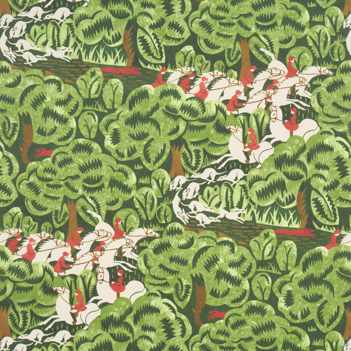 Use:Part of the New Yorker Collection, Margaret Schloeman's Fox Chase wallpaper was inspired by the artist's fabulous illustration for the magazine's November 7, 1931, cover. Lively and graphic, this medium-scale fox hunt pattern has a stylized Art Deco aesthetic that still looks modern today. Also available as a fabric.