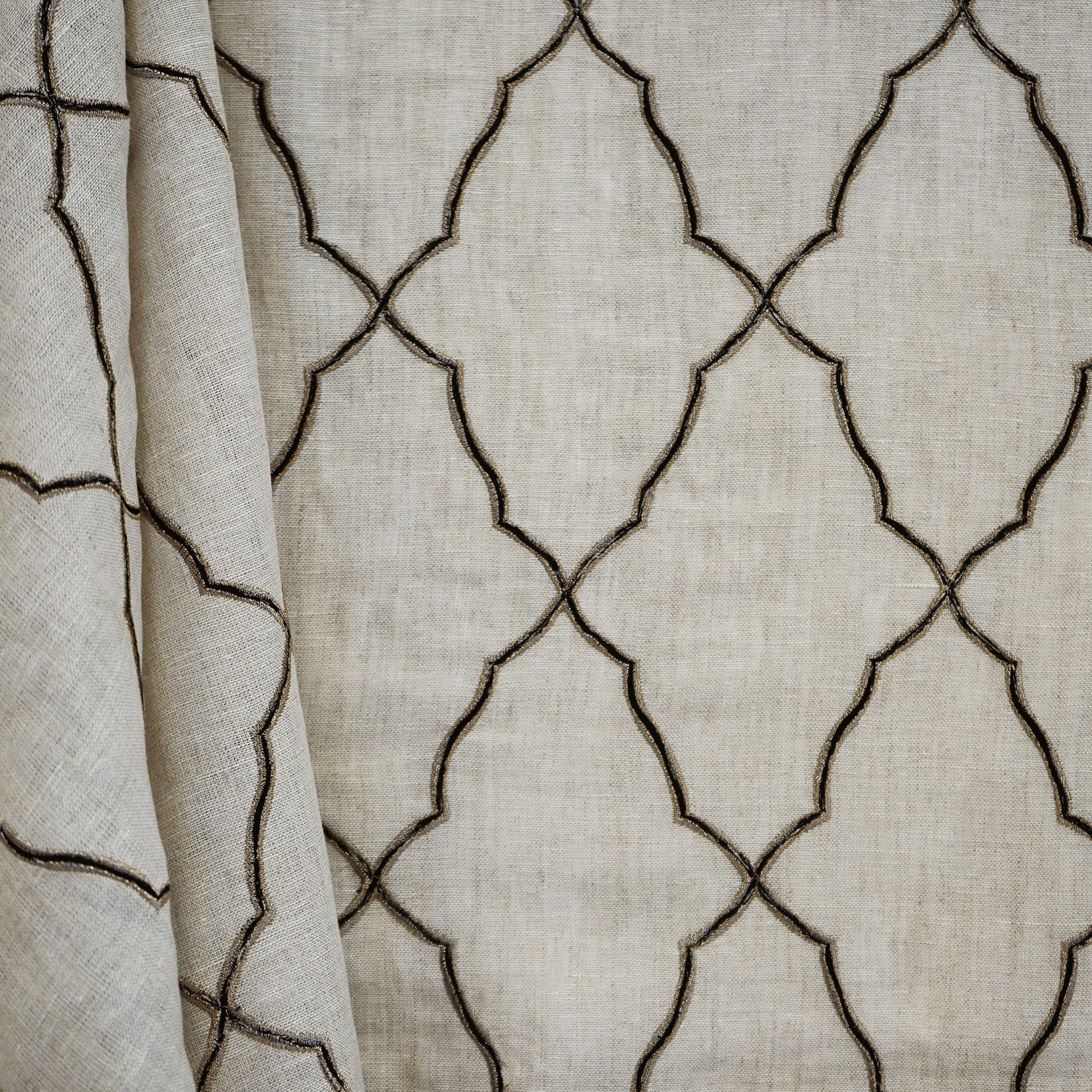 Use:Arpel is a beautiful embroidery linen fabric. This geometric pattern is featured in black and metallic threads on a classic linen basecloth.