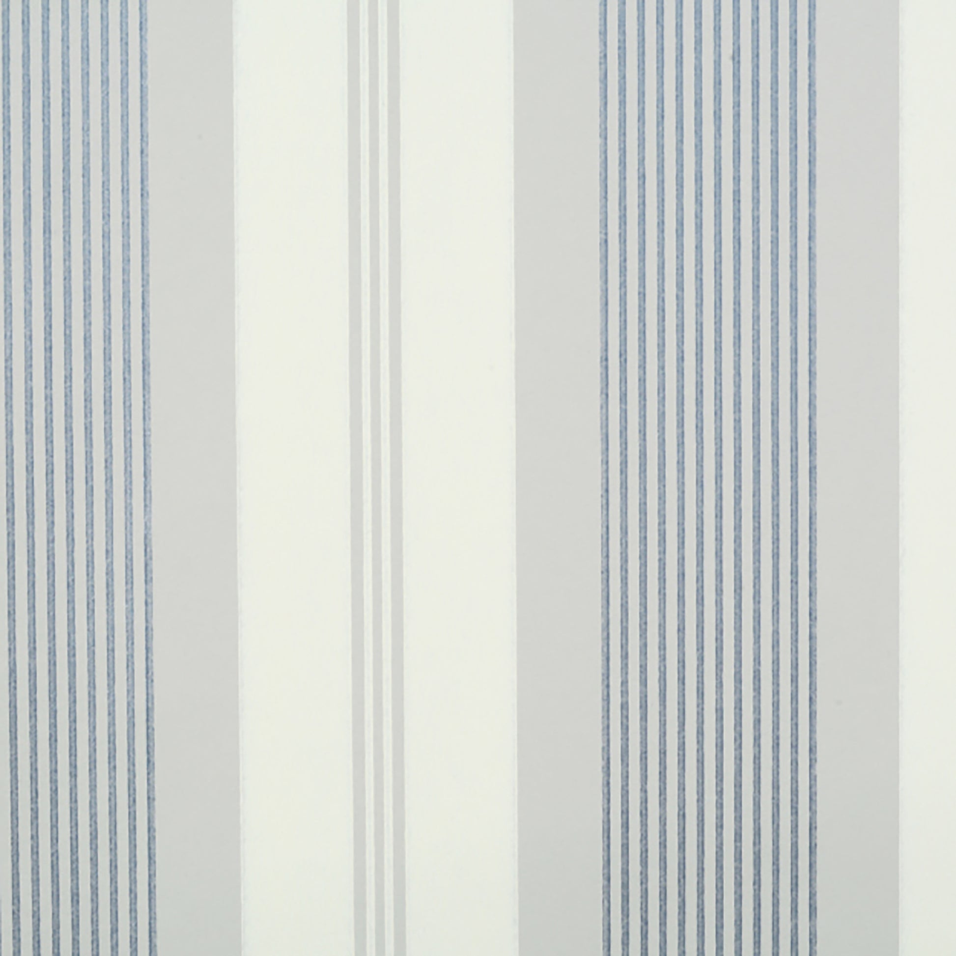 Use:Traditional multi width stripe wallpaper, with a matte finish in hues of ivory, cool blue and gray.