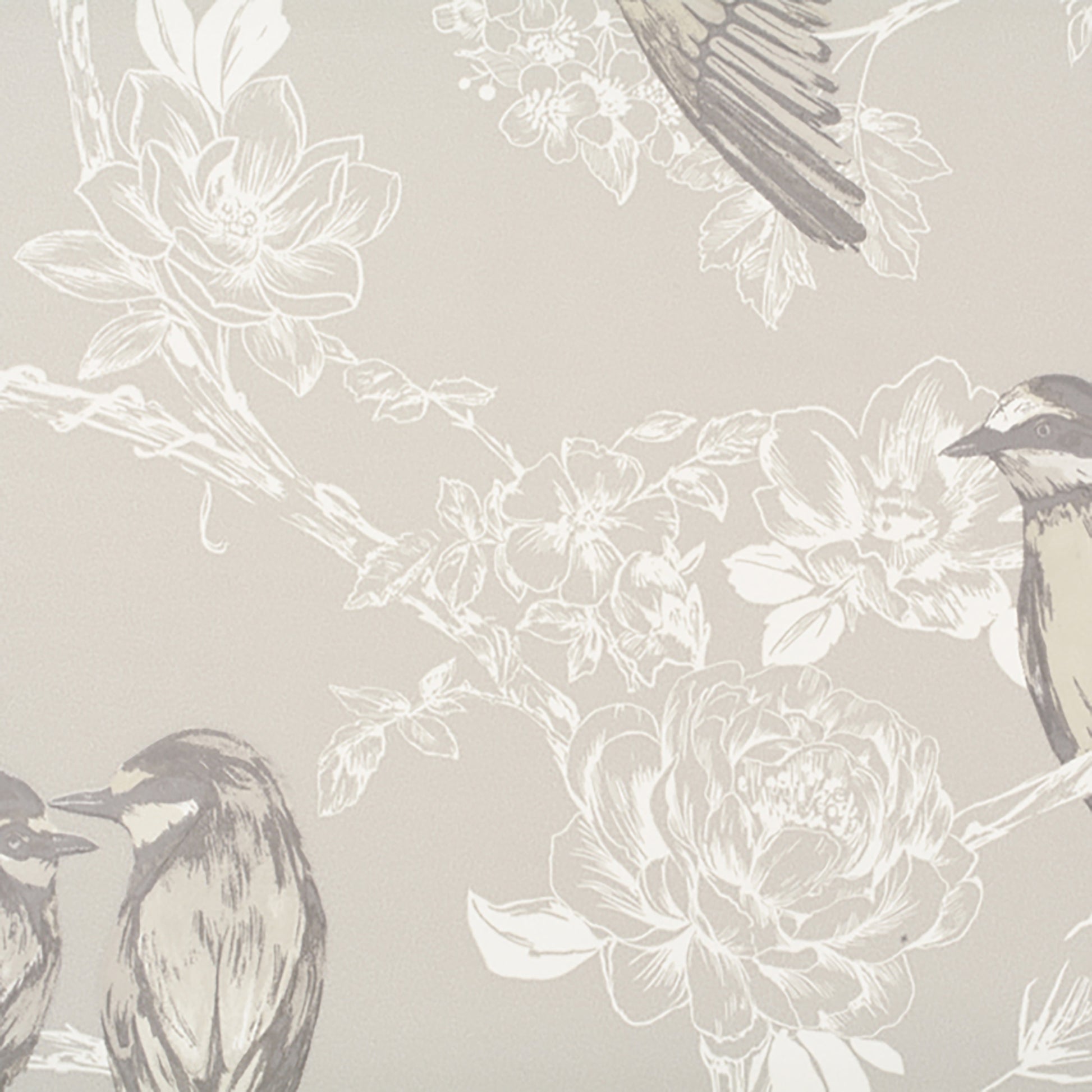 Use:Traditional floral vine design wallpaper in neutral tone of ivory on a gray ground with beige and gray songbirds in flight and perched on a branch.