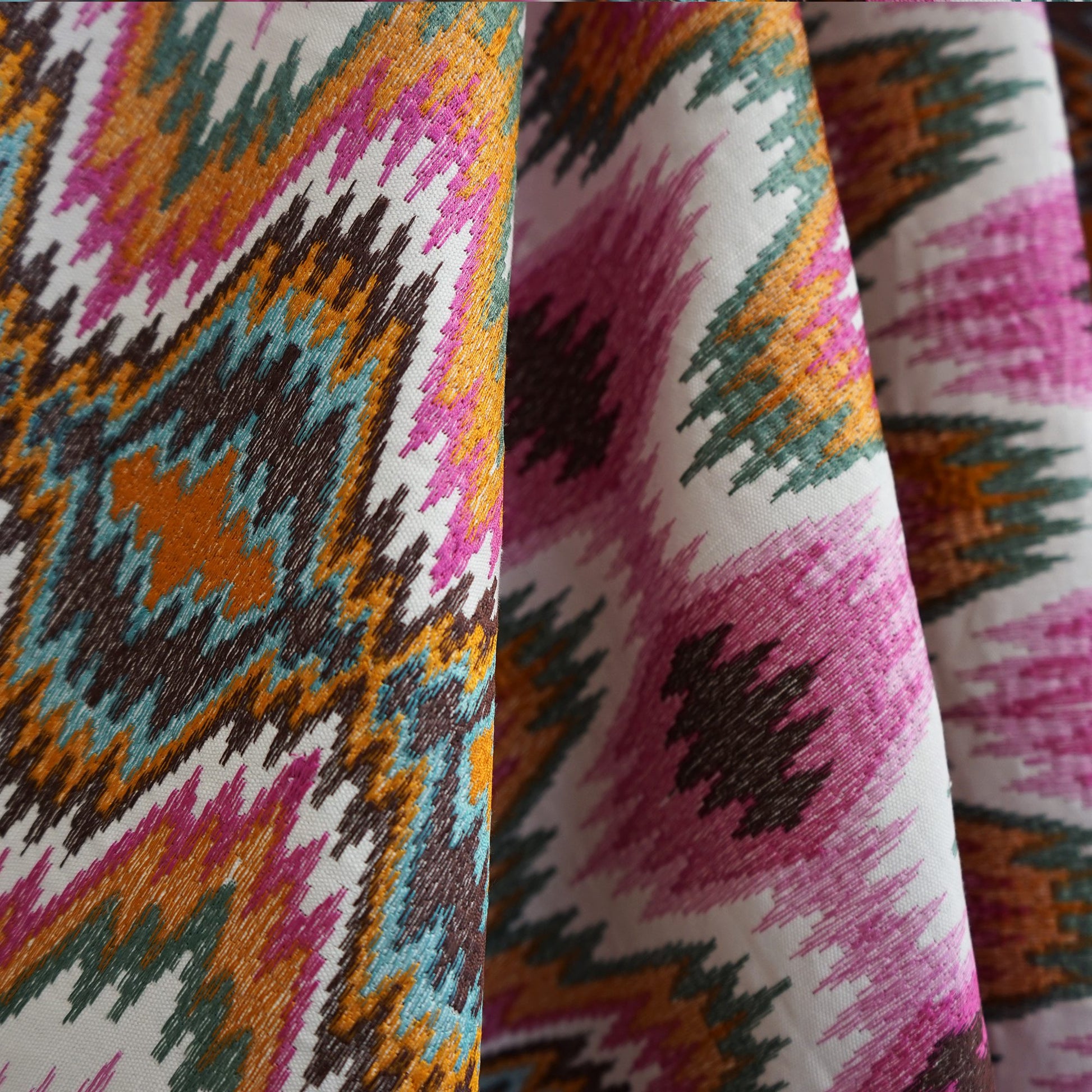 Use:Colorful large scale ogee stripe with zigzag edging design. This fabric features bright pink, orange, blue, teal, brown and ivory hues.