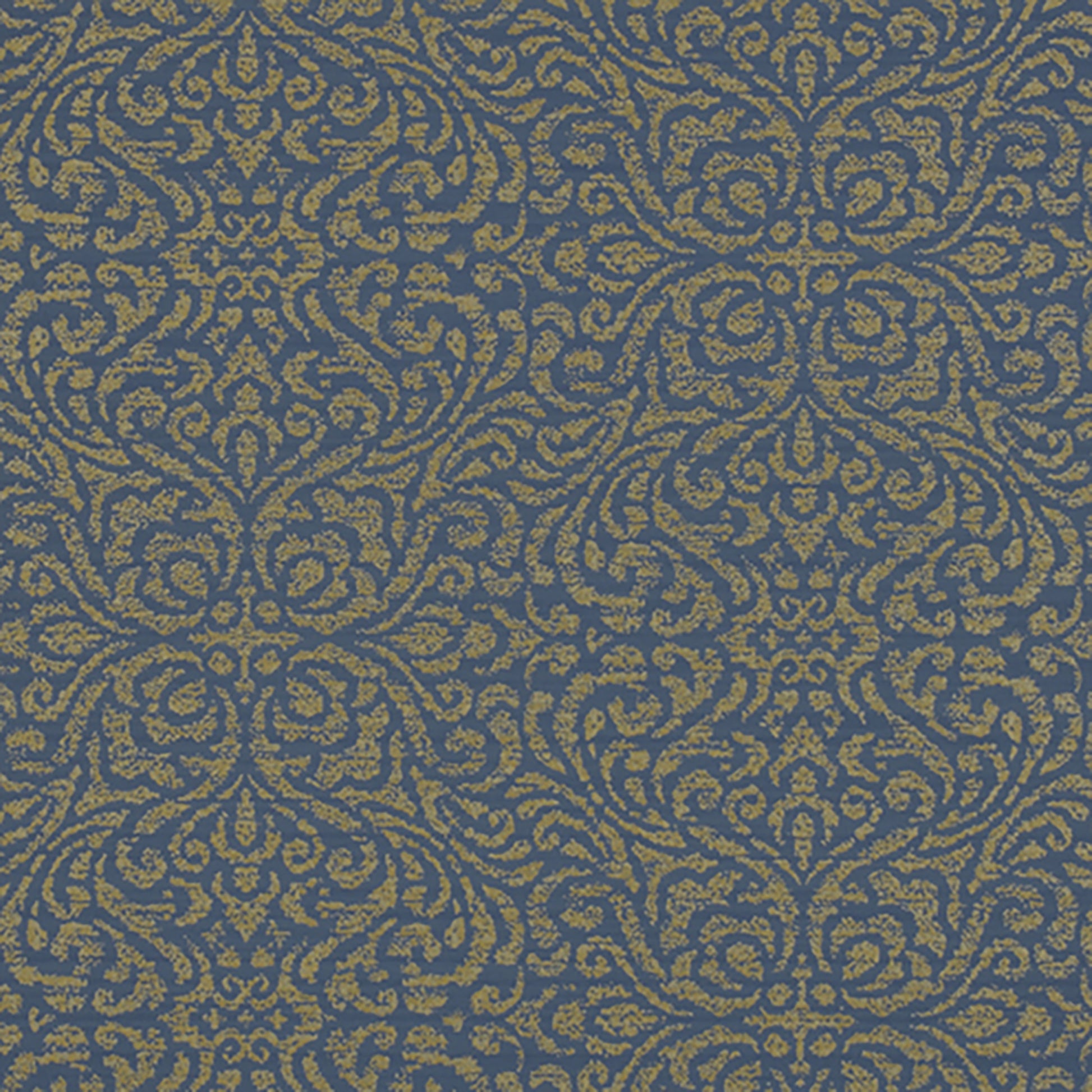 Use:African inspired tribal damask design wallpaper. In a dresden blue with metallic gold coloration.