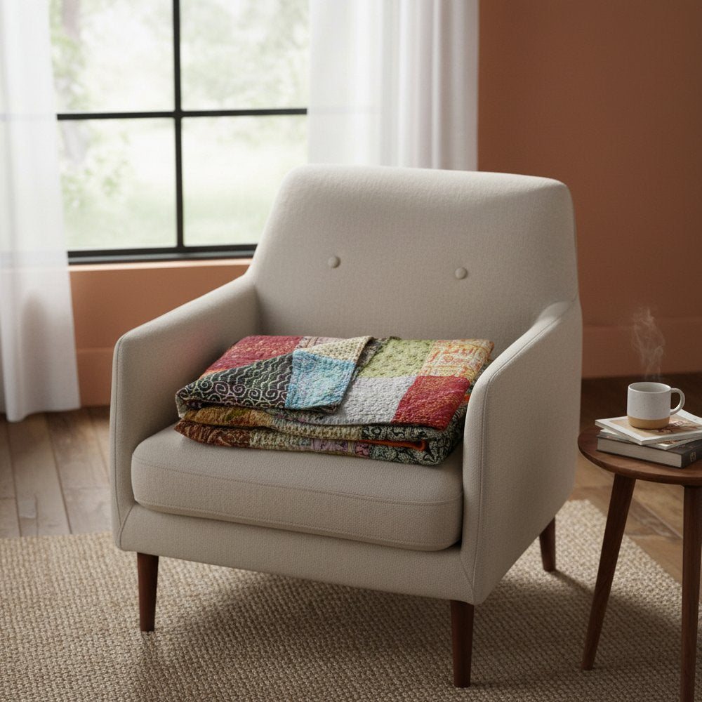 60" X 90" Blue Black and Brown Kantha Cotton Patchwork Throw Blanket with Embroidery