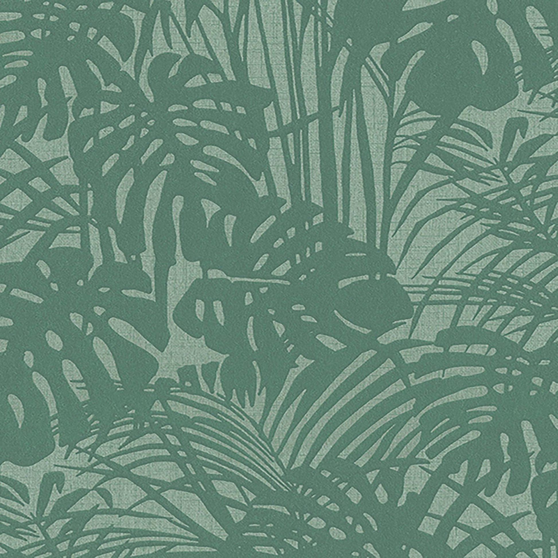 Use:This wallpaper features a textured abstract palm leaf pattern in teal on a metallic light green toned background.