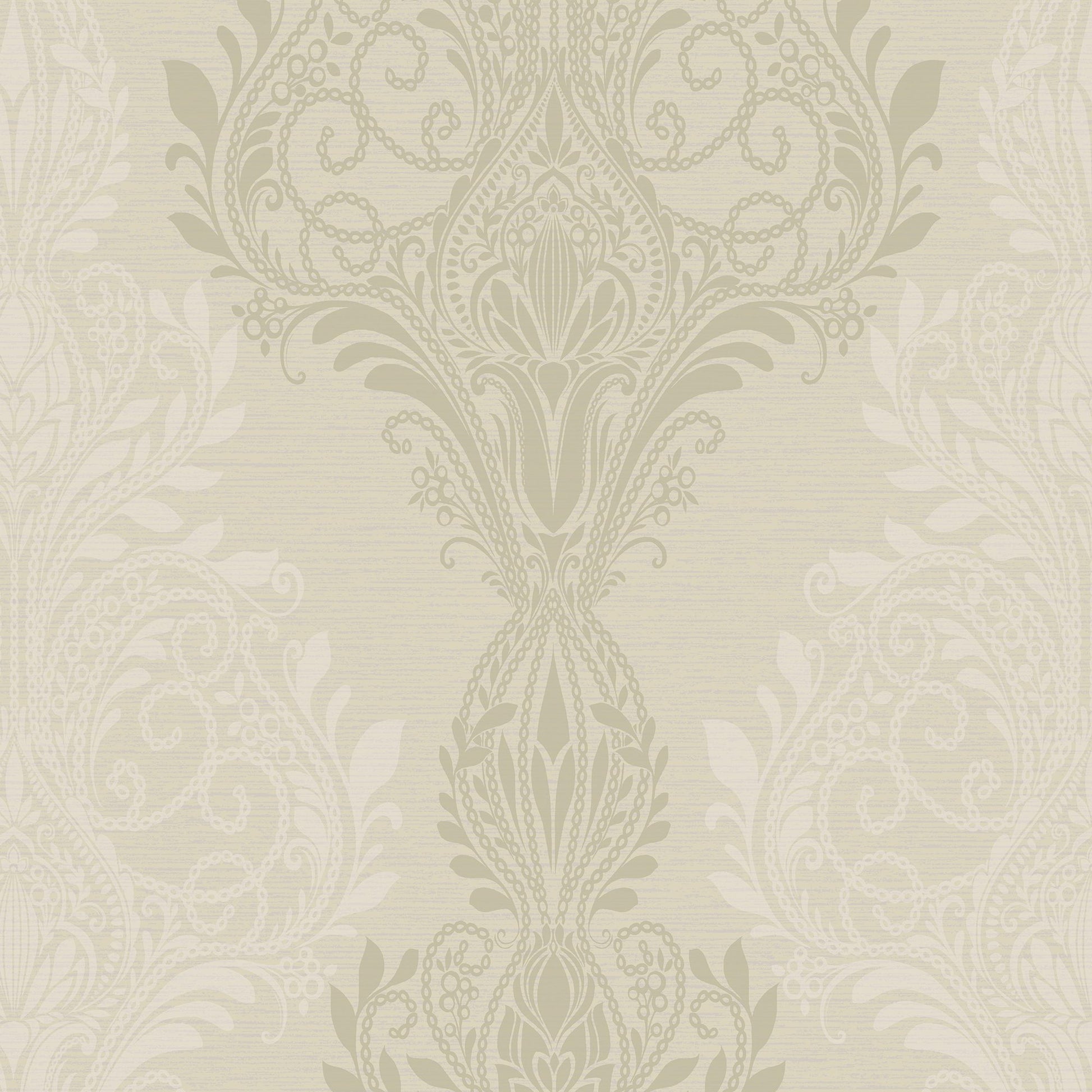 Use:A stunning beaded damask wallpaper with gold metallic, shimmering elegance for your walls. Light taupe coloration.