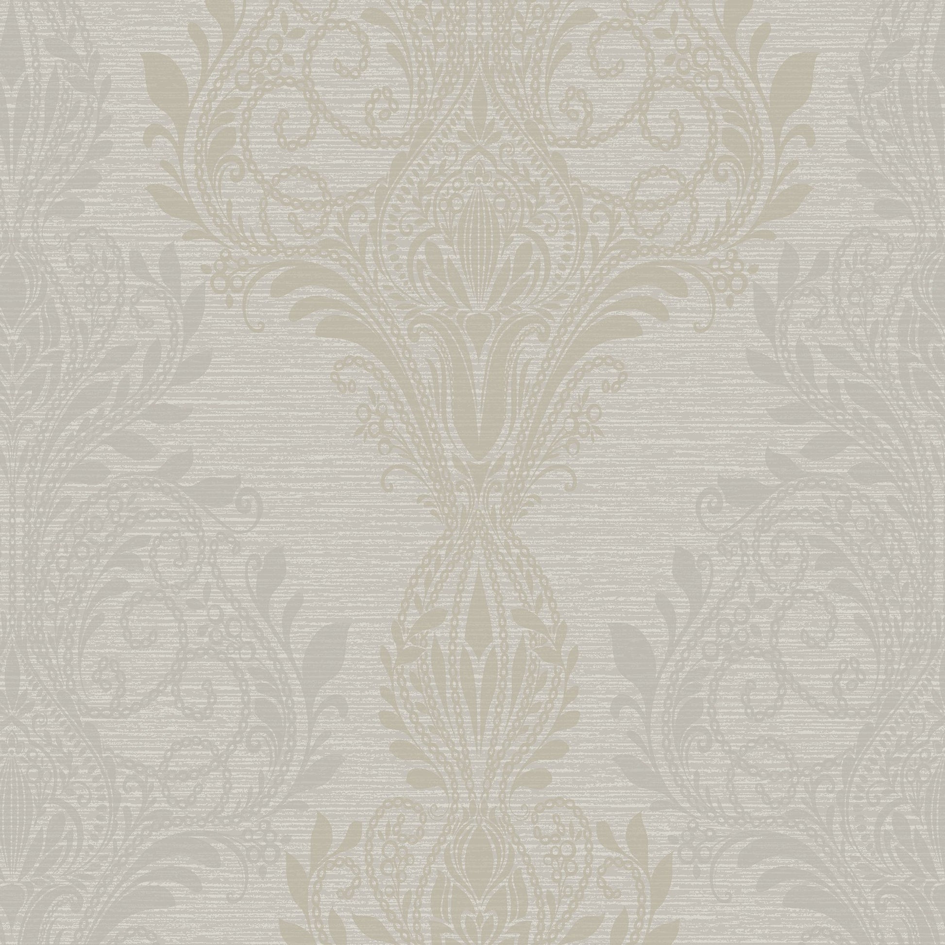 Use:Elegance for your walls, a stunning damask wallpaper, shimmering gold metallic design on a taupe ground.