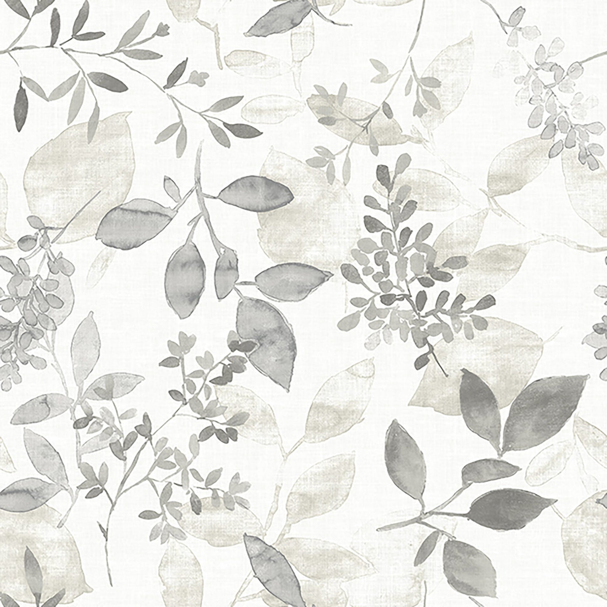 Use:A botanical leaf design wallpaper in neutral hues of grey and taupe on a cream ground.