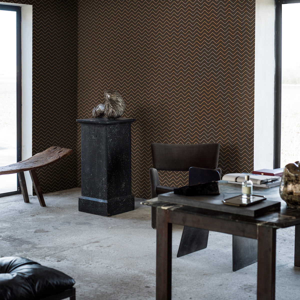 Use:Chevron Dots in brown-and-gold is a wildly chic wallpaper pattern consisting of wavy, zigzagging lines that appear to move rhythmically. This Bor?stapeter print is effortlessly stylish and exudes confident coolness. This product is FSC Certified. Available in North America exclusively through Schumacher.