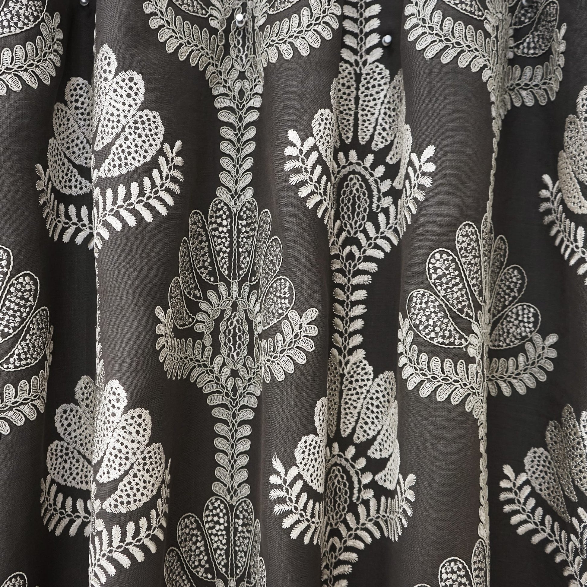 Use:This stunning floral embroidery fabric will be the focal point of any room with its intricate detailing. Silver stitching on a charcoal linen basecloth.