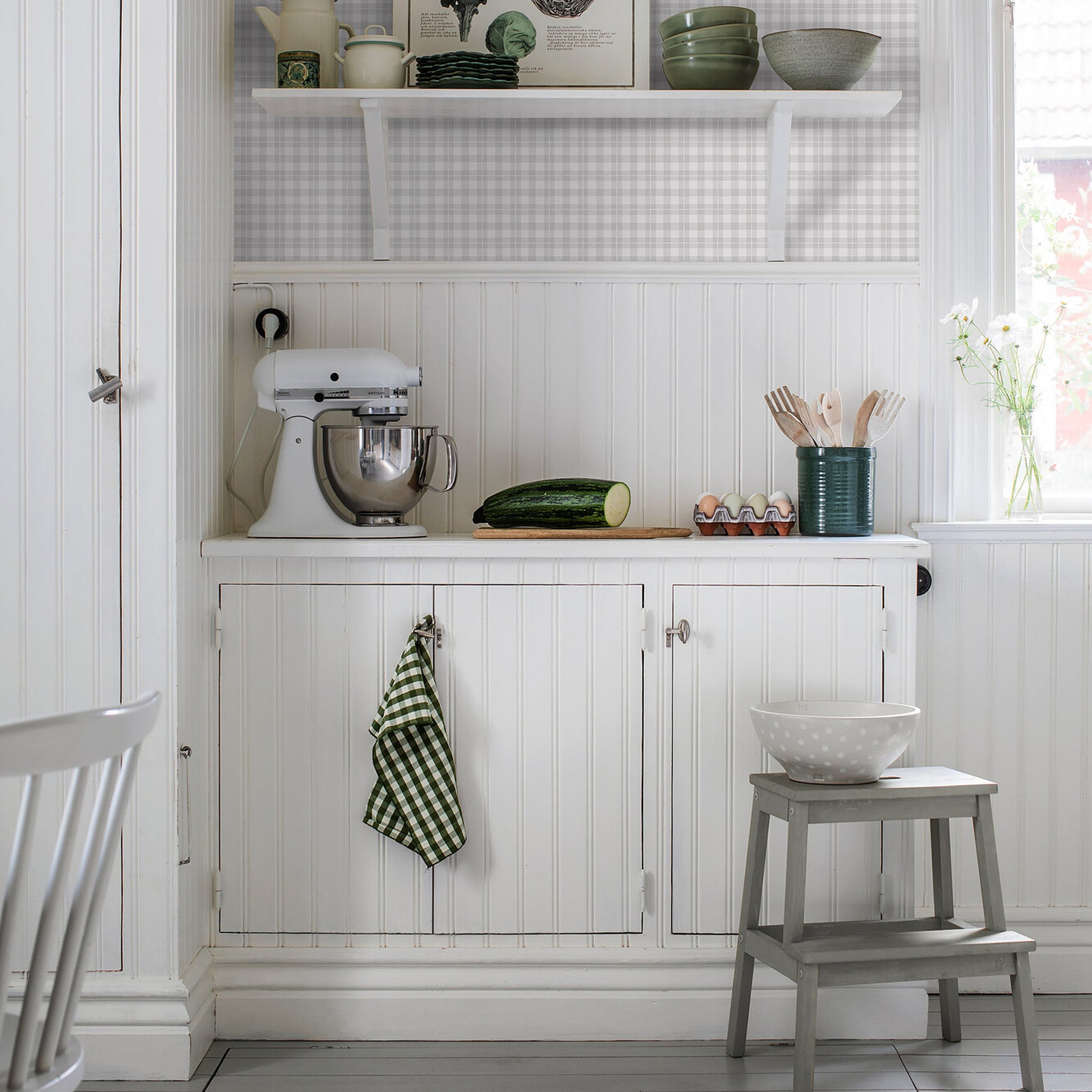 Use:Frida in grey features a classic checked pattern inspired by vintage Swedish kitchen towels and tablecloths. This wallpaper, designed by Scandinavian brand Bor?stapeter, imbues interiors with cheery nostalgia. This product is FSC Certified. Available in North America exclusively through Schumacher.