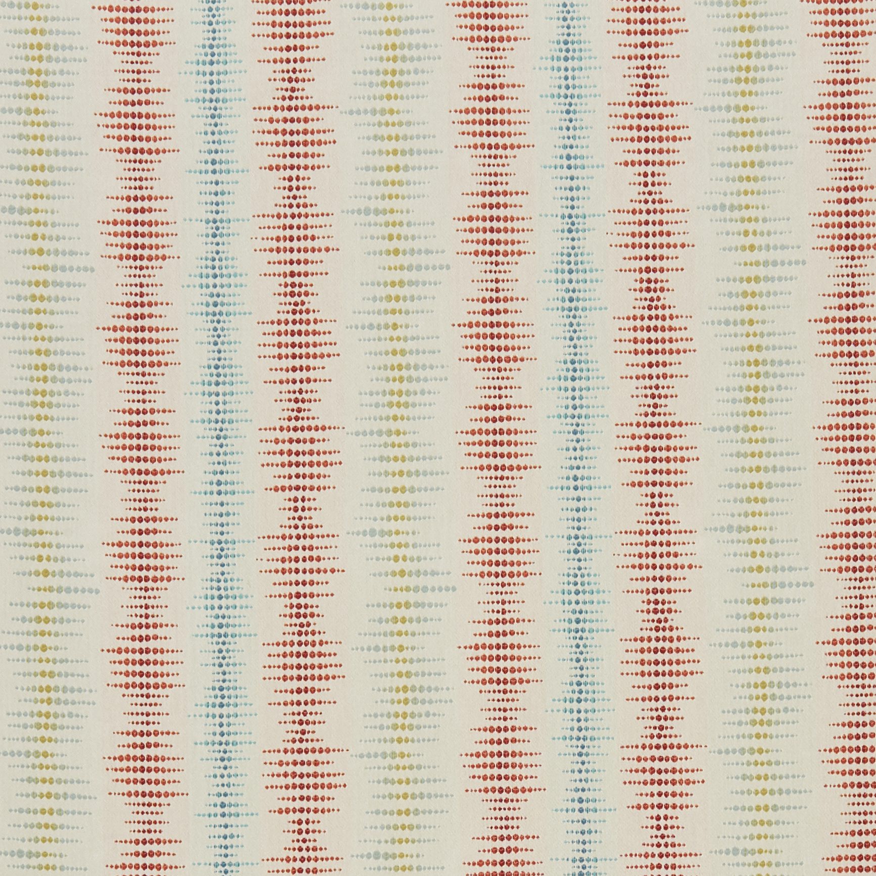 Use:Fun with dots, with this geometric stripe design on an indoor/outdoor jacquard fabric. In multi shades of light blue, teal, lime green and orange with a cream background.
