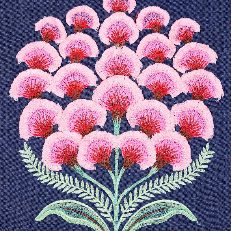 Use:This extraordinary floral just begs to be touched. Stylized, satin stitched blossoms are edged with hand-clipped fringe, making it a fabulous accent fabric for curtains and pillows.