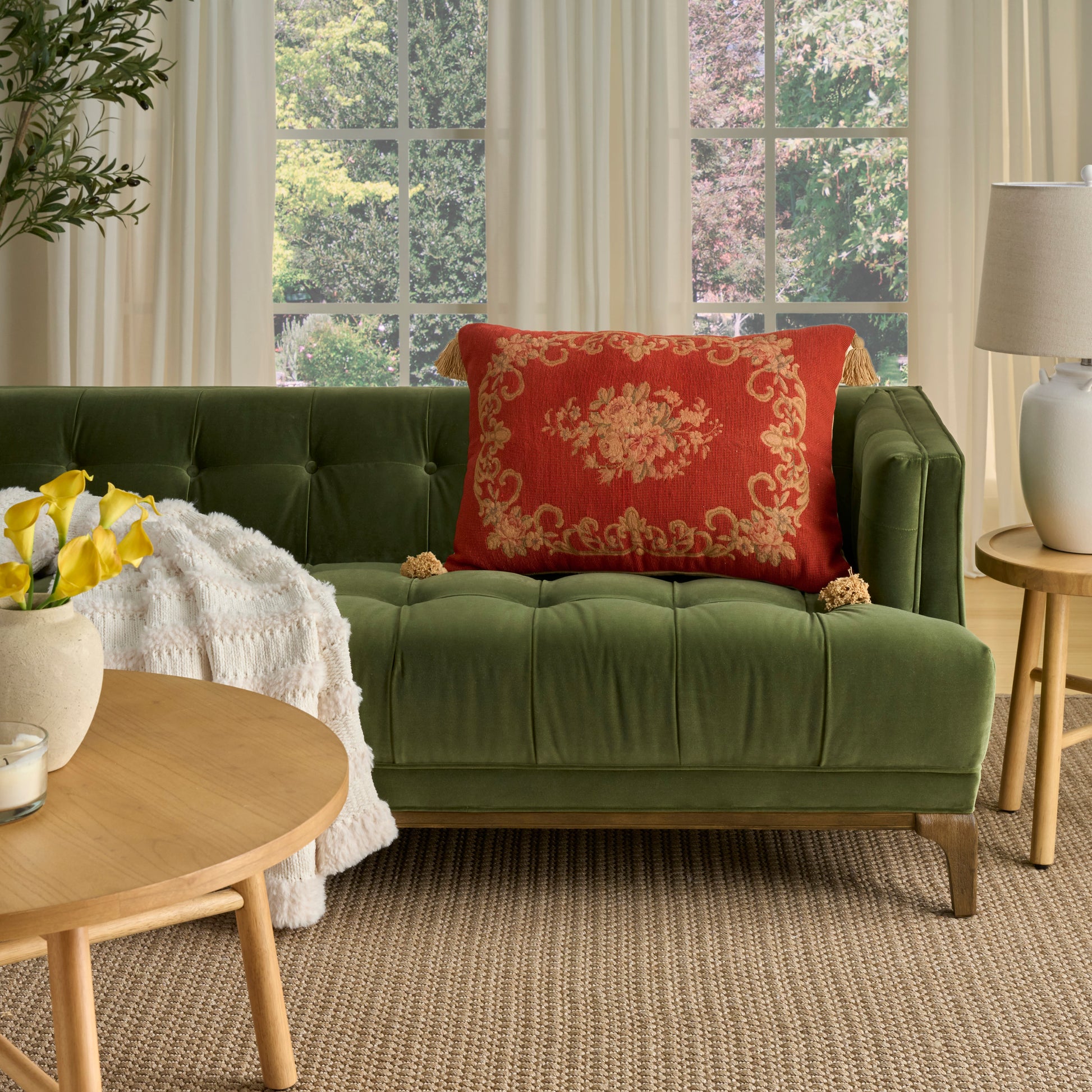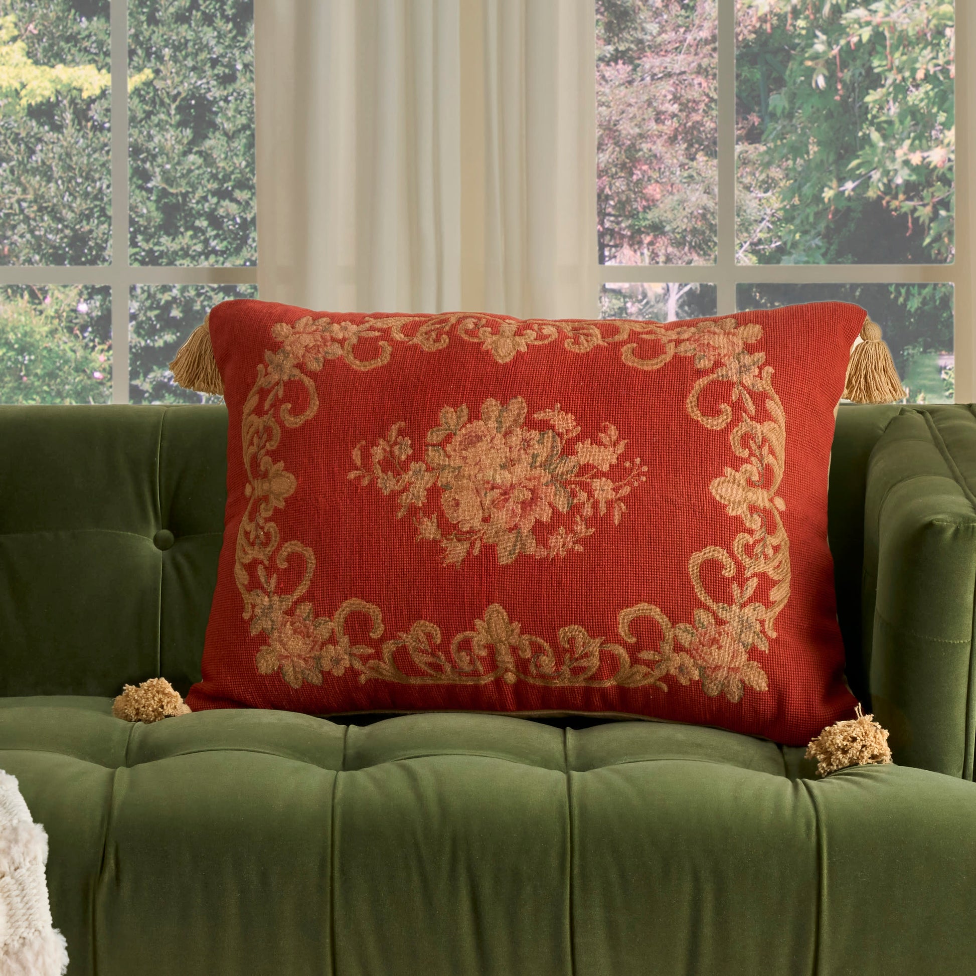 Construction/ Insert: Vintage-inspired designs with handstitched patterns;Cotton cover with a velvet finish and wool petit point panels;Available in a variety of colors, patterns, and sizes to complement a variety of seating arrangements;Some patterns do not include tassels;Please note: Our throw pillows are shipped in eco-conscious vacuum wrapping. When you first remove it from its wrapper, it may seem a little flat. Not to worry! To restore your pillow to its original, plump form, simply fluff it and let it sit for at least 24 to 48 hours;;