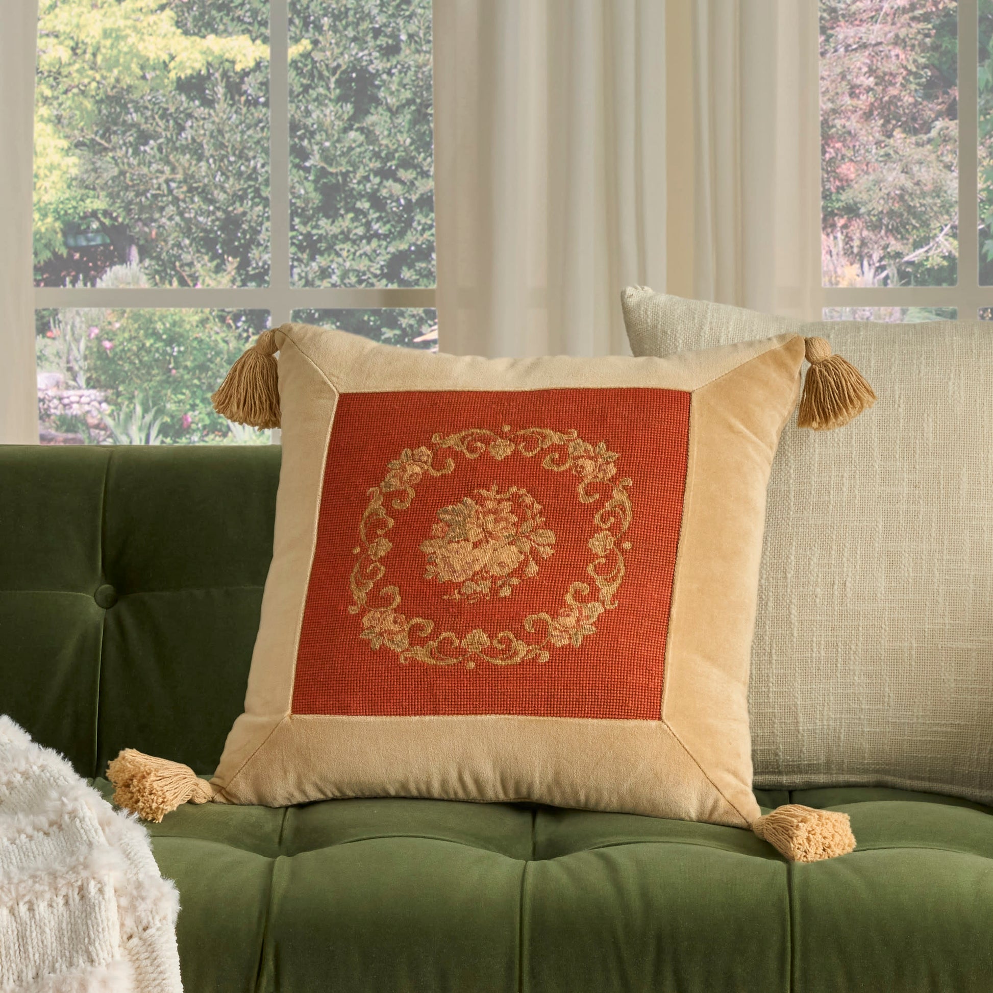 Construction/ Insert: Vintage-inspired designs with handstitched patterns;Cotton cover with a velvet finish and wool petit point panels;Available in a variety of colors, patterns, and sizes to complement a variety of seating arrangements;Some patterns do not include tassels;Please note: Our throw pillows are shipped in eco-conscious vacuum wrapping. When you first remove it from its wrapper, it may seem a little flat. Not to worry! To restore your pillow to its original, plump form, simply fluff it and let it sit for at least 24 to 48 hours;;