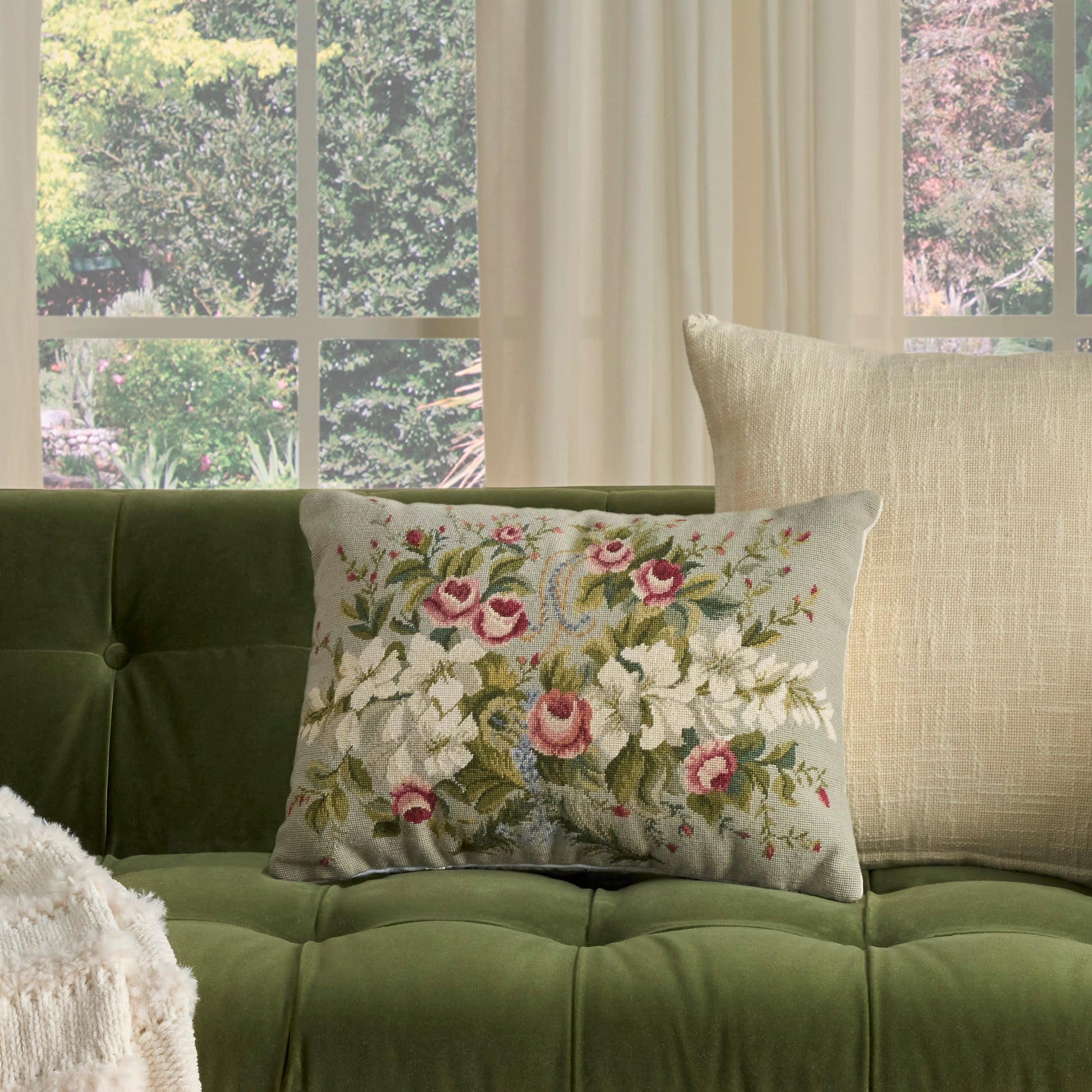 Construction/ Insert: Vintage-inspired throw pillows with handstitched patterns;Cotton cover with a velvet finish and wool petit point center panel;Available in a variety of colors, patterns, and sizes to complement a variety of seating arrangements;Some patterns do not include tassels;Please note: Our throw pillows are shipped in eco-conscious vacuum wrapping. When you first remove it from its wrapper, it may seem a little flat. Not to worry! To restore your pillow to its original, plump form, simply fluff it and let it sit for at least 24 to 48 hours;;
