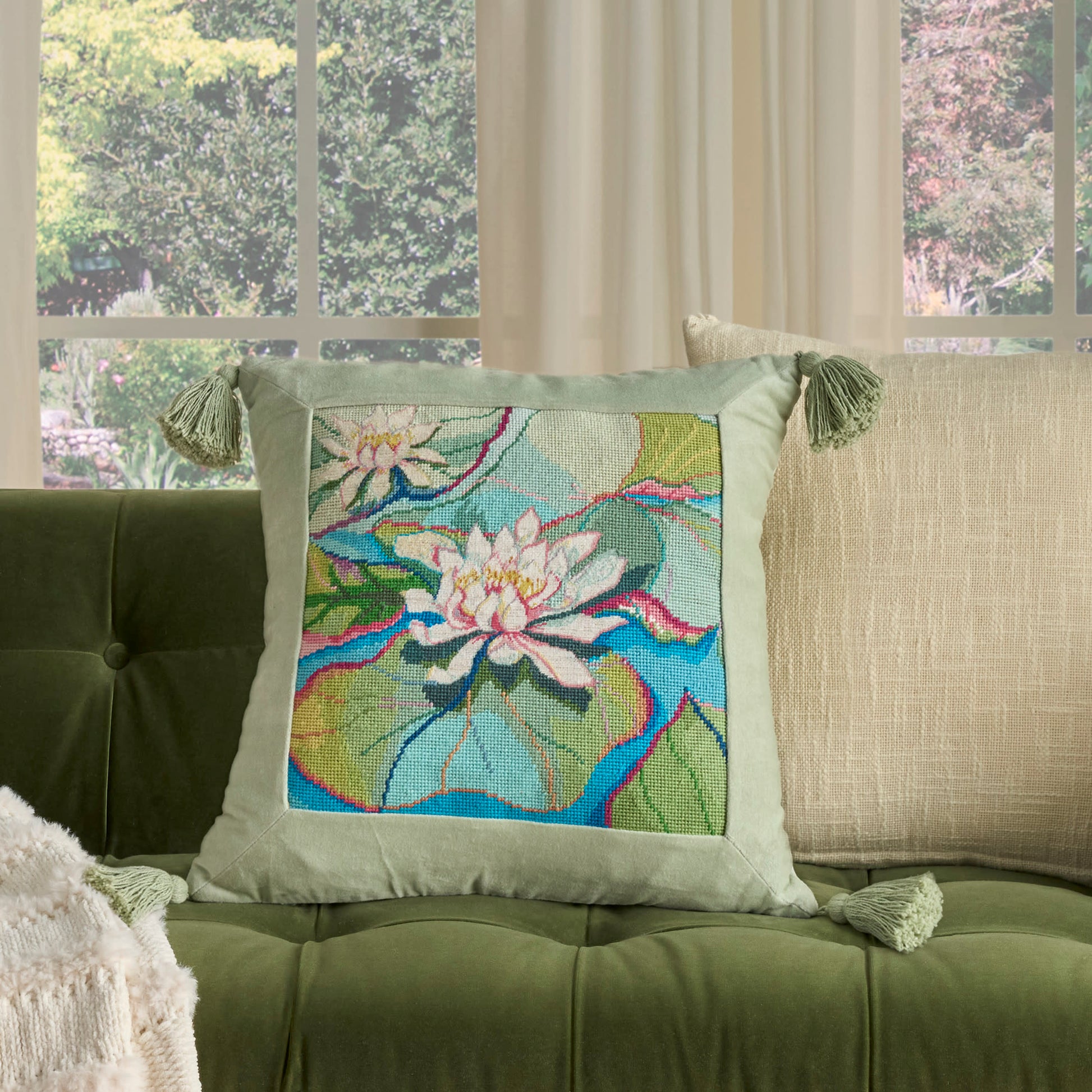 Construction/ Insert: Vintage-inspired throw pillows with handstitched patterns;Cotton cover with a velvet finish and wool petit point center panel;Available in a variety of colors, patterns, and sizes to complement a variety of seating arrangements;Some patterns do not include tassels;Please note: Our throw pillows are shipped in eco-conscious vacuum wrapping. When you first remove it from its wrapper, it may seem a little flat. Not to worry! To restore your pillow to its original, plump form, simply fluff it and let it sit for at least 24 to 48 hours;;