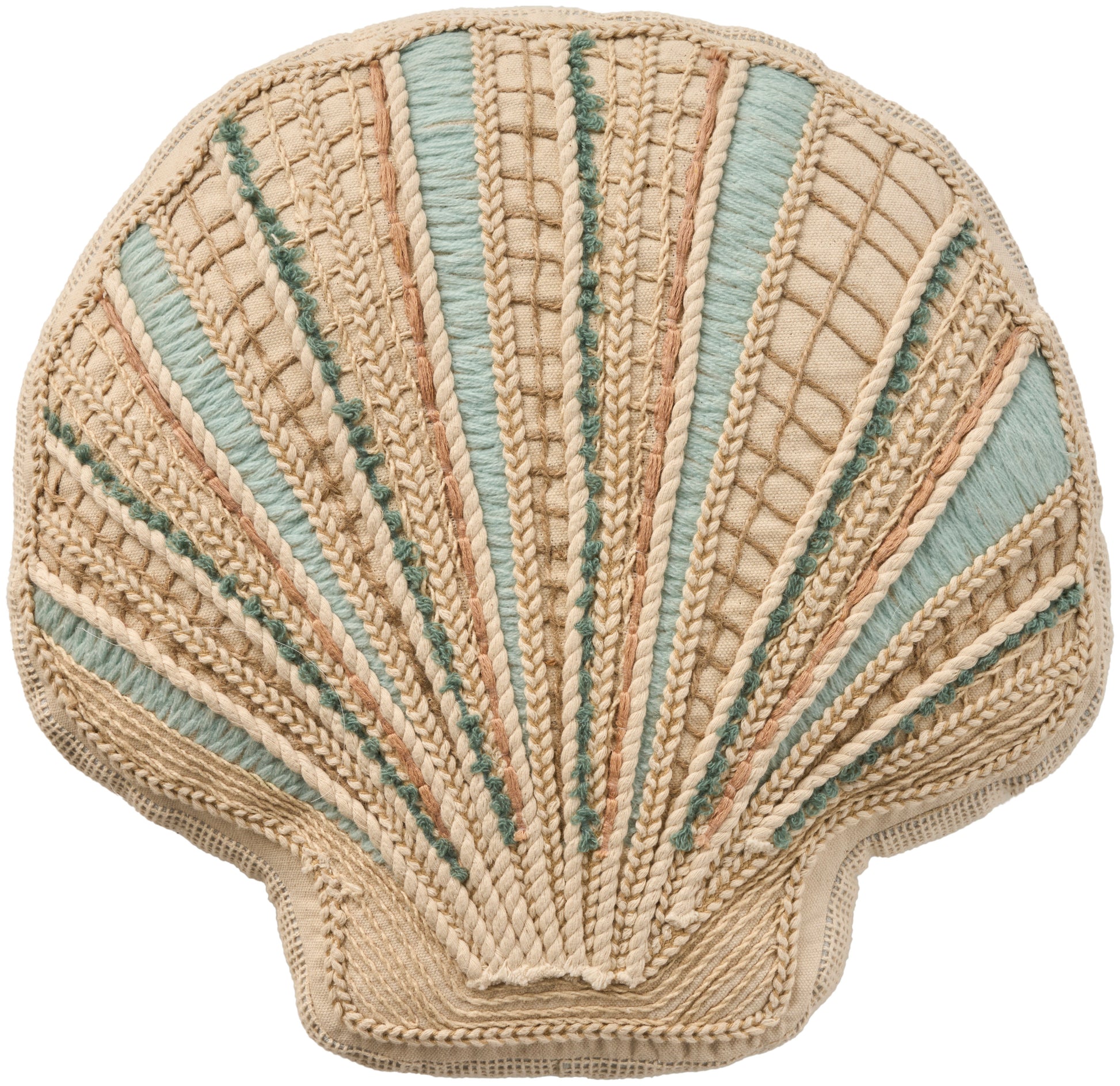 Construction/ Insert: Seashell-shaped decorative throw pillow adds coastal flair to your d??cor;Embellished details including jute netting embroidered accents add unique dimension;100% cotton cover;Throw pillow measures 15-inches x 15-inches;Please note: Our throw pillows are shipped in eco-conscious vacuum wrapping. When you first remove it from its wrapper, it may seem a little flat. Not to worry! To restore your pillow to its original, plump form, simply fluff it and let it sit for at least 24 to 48 hours;;