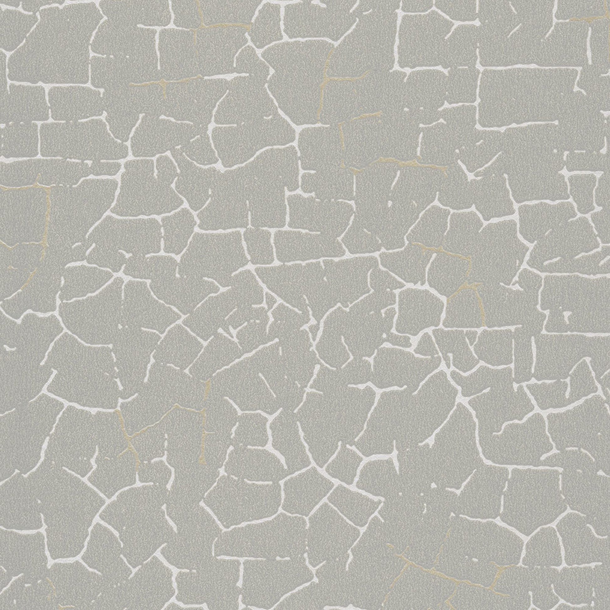 Use:A weathered craquelure patterned wallpaper. A stone gray colored ground with metallic silver and gold accents.