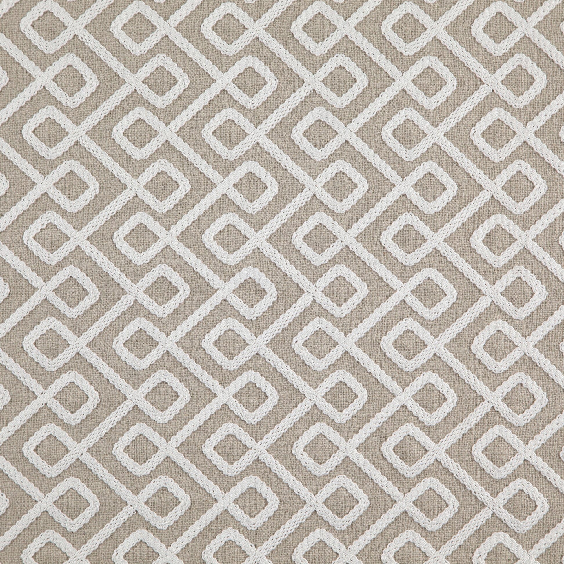 Use:Textural geo pattern embroidered on a faux burlap basecloth. In a dark beige and cream coloration.