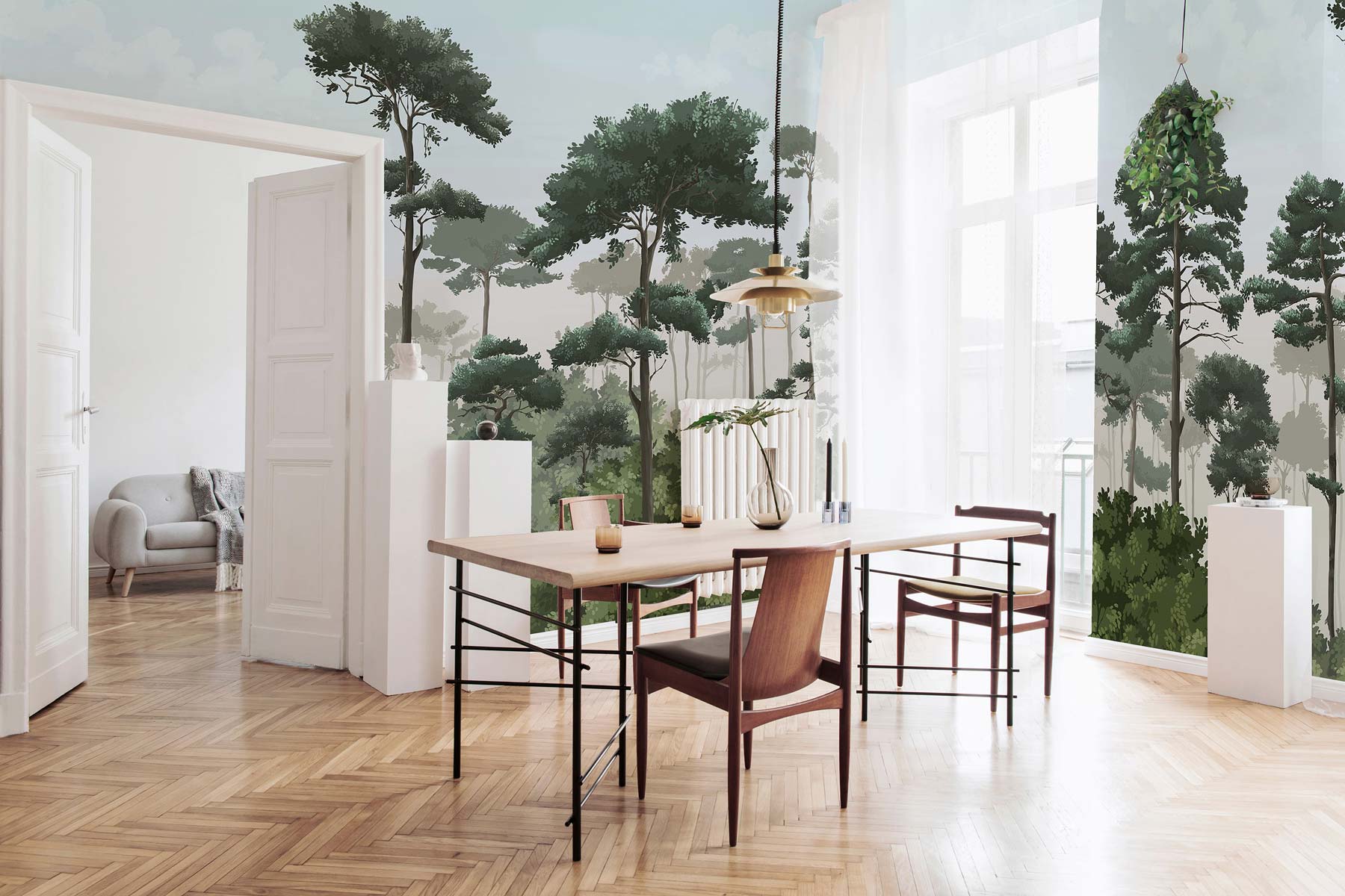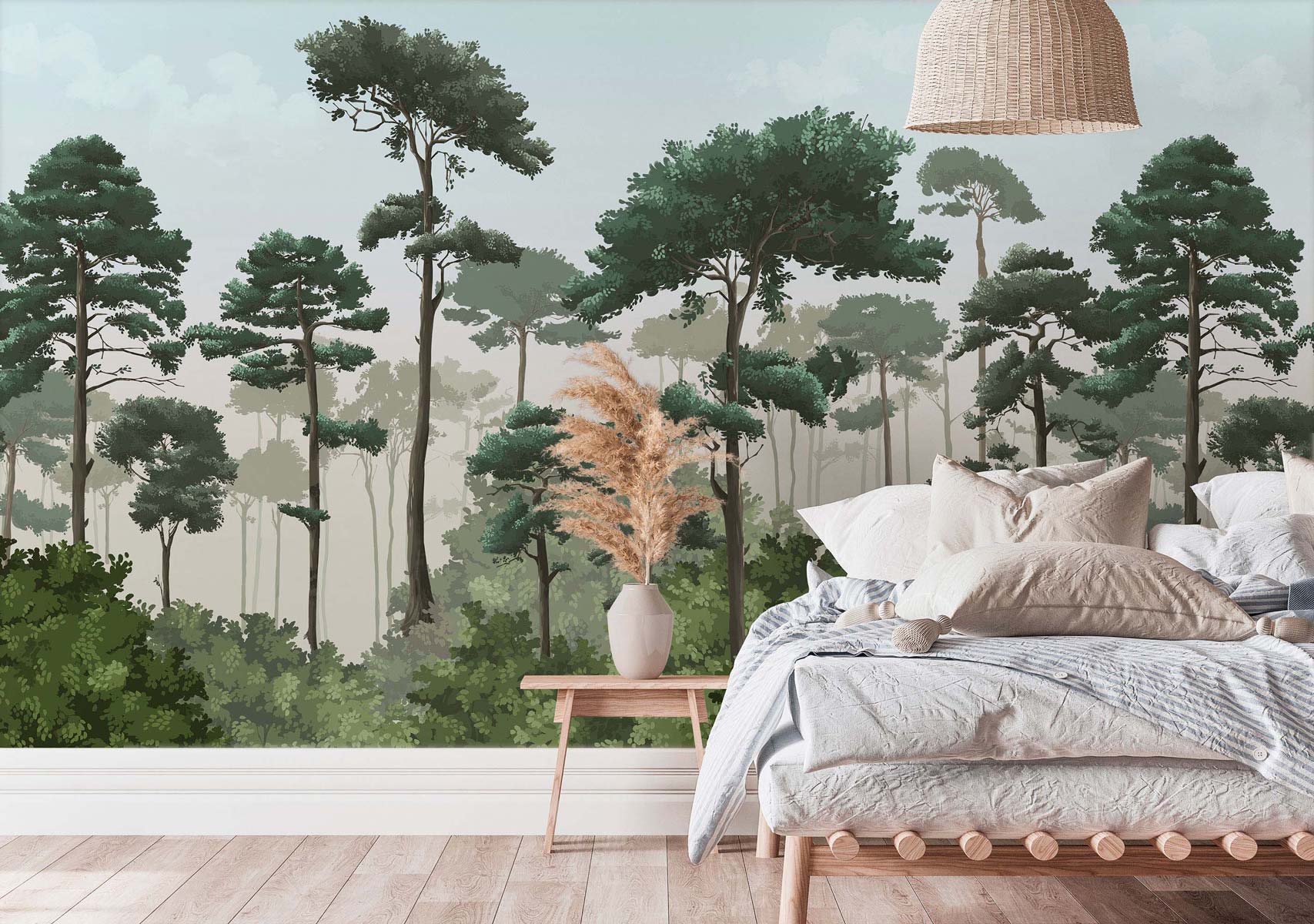 Use:Create a serene, nature-inspired retreat with our "Matsu" wallpaper mural. Featuring towering pine trees set against a soft, cloud-filled sky, this mural captures the peaceful beauty of a forest at dawn. Its timeless design brings a calming ambiance to bedrooms, living rooms, or any space seeking a tranquil, organic touch. This exquisite mural comes in a variety of colorways, allowing you to find the perfect fit for your interior style and your mood. Printed on premium, eco-friendly non-woven paper with a matte finish for a seamless designer look. Easy to install (simply paste the wall!) and instantly remove in full strips, this mural ensures lasting beauty in your home.