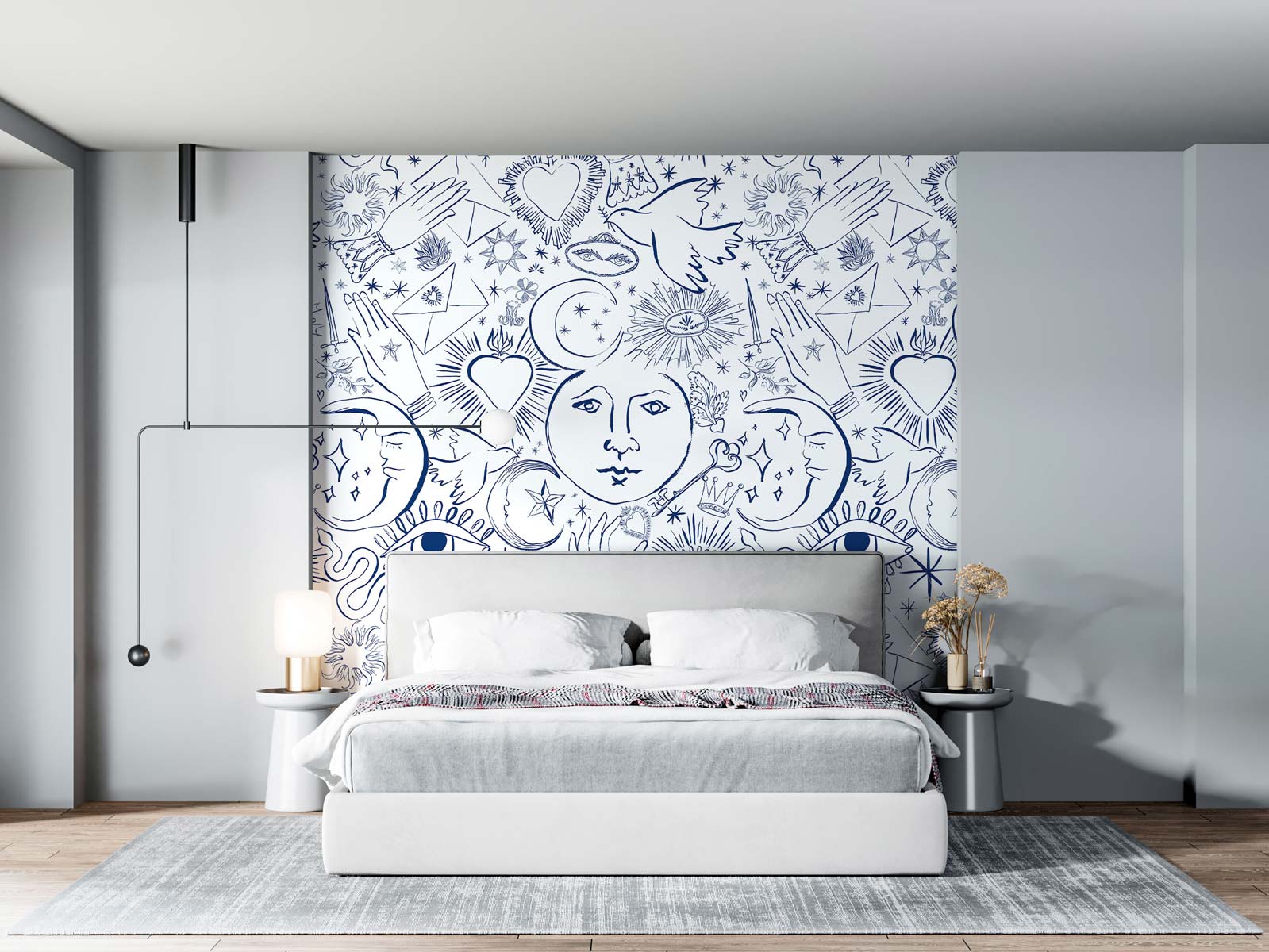 Use:Step into a world of celestial wonder with the "Mystic" wallpaper mural, featuring hand-drawn illustrations of moons, stars, eyes, and other ethereal symbols. This whimsical design adds a touch of magic and intrigue to any space, creating a dreamy atmosphere perfect for living rooms, bedrooms, or creative spaces. The mural's bold, artistic lines bring a unique and enchanting focal point to your home. Available in a variety of exquisite colorways, this mural is printed on premium, eco-friendly non-woven paper with a matte finish for a seamless designer look. Easy to install (simply paste the wall!) and instantly remove in full strips, it ensures lasting beauty in your space.
