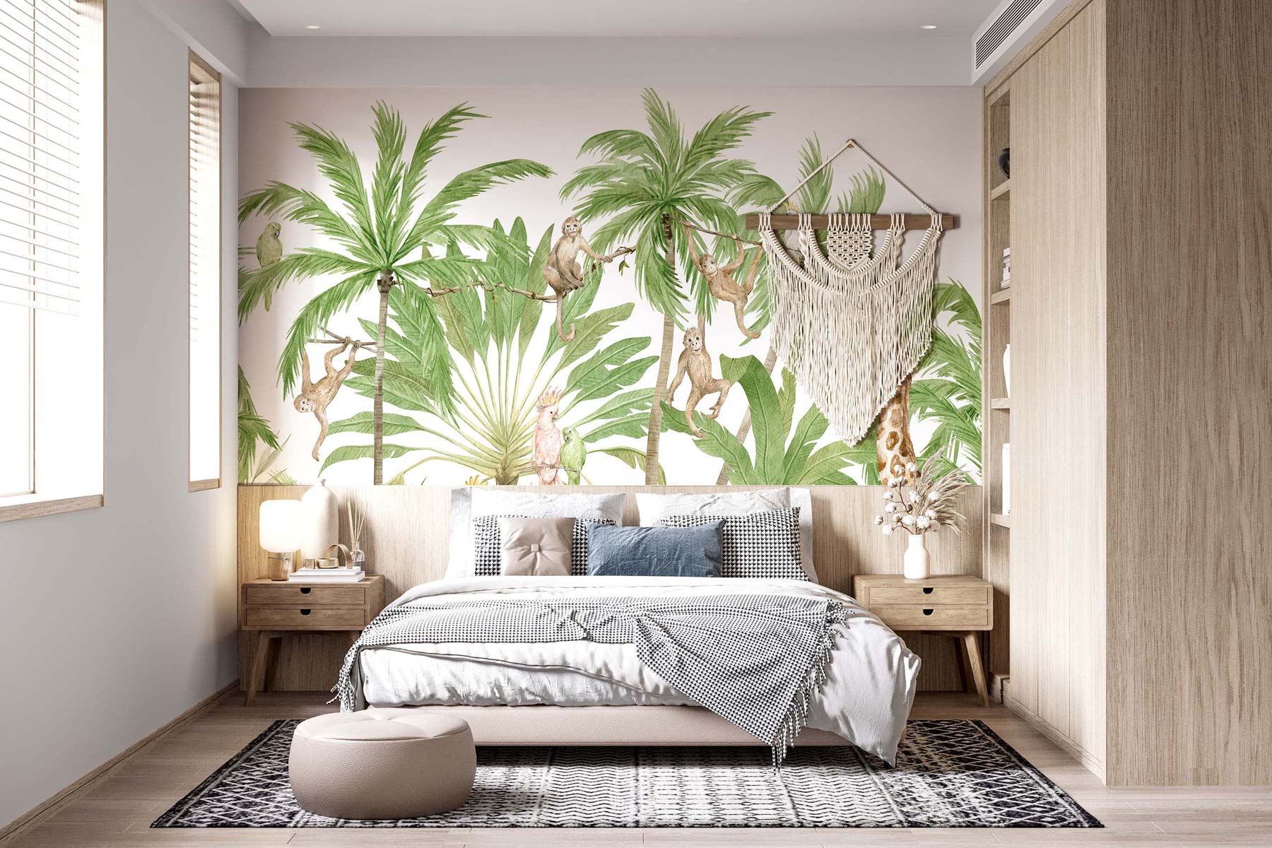 Use:Transform your space into a lush, tropical paradise with the Palm Tree Mural. This stunning wall mural features vibrant palm trees, playful monkeys, a curious giraffe, and a zebra, all hand-illustrated to evoke the serenity and adventure of a safari. The rich green foliage contrasts beautifully against a soft cream backdrop, adding both depth and tranquility to any room. Perfect for a nursery, living room, or any creative space, this mural brings nature's wonder indoors, creating an immersive and whimsical environment that sparks the imagination. Crafted with premium, easy-to-install (just paste the wall!), ultra-removable (in full strip!), designer matte, seam-free non-woven materials, the Palm Tree Mural is easy to apply and remove, making it a flexible design statement that suits your evolving style. Bring a breath of the wild into your home with this captivating piece of art.